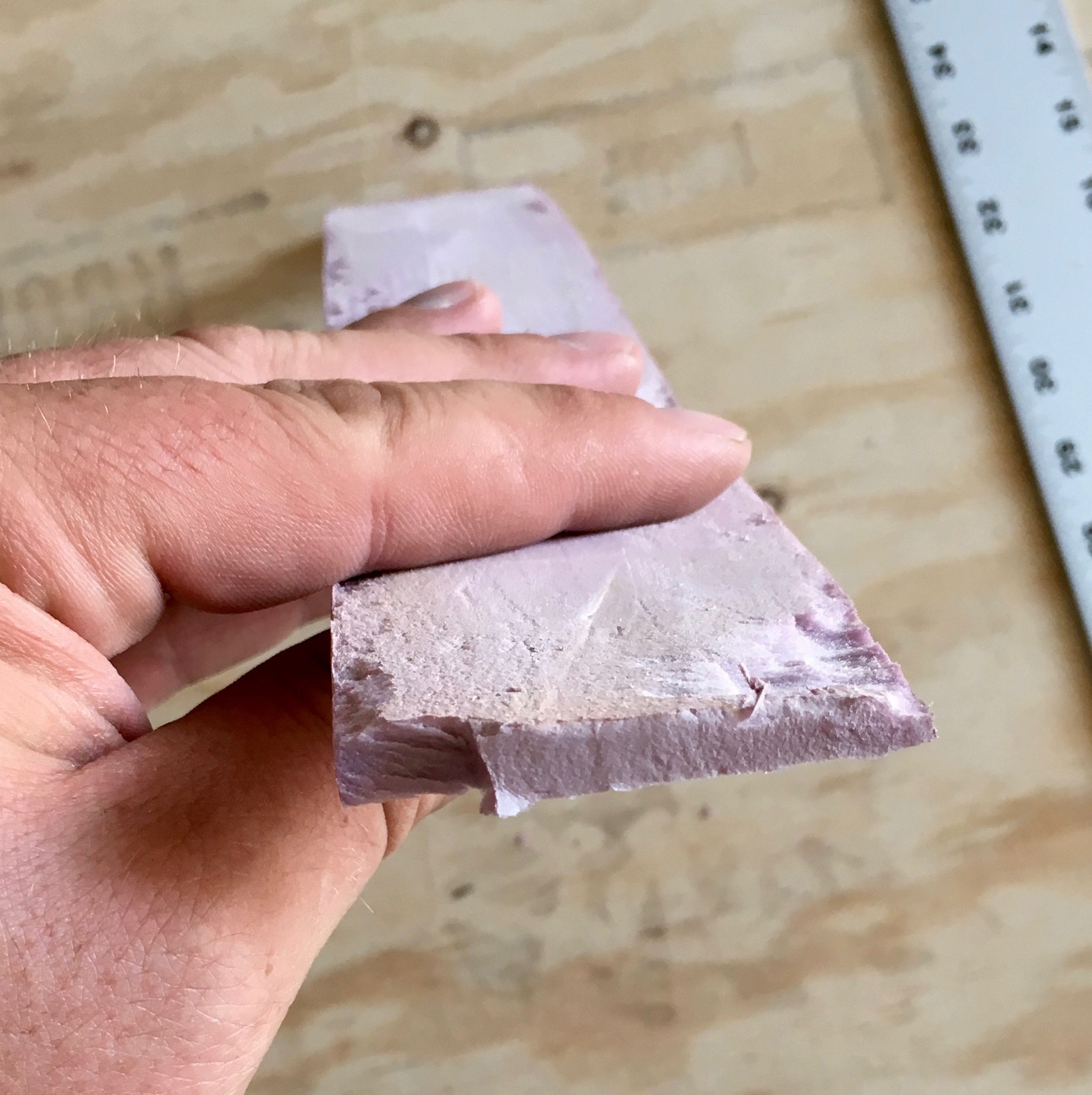 This is the result of cutting halfway and breaking it - the right side is the smooth cut by knife, and the left side is where it broke along the grain. You can see that the knife cut is radically smoother than anything you’ll get with a serrated blade. I really wish I’d known about this method when I built my office!