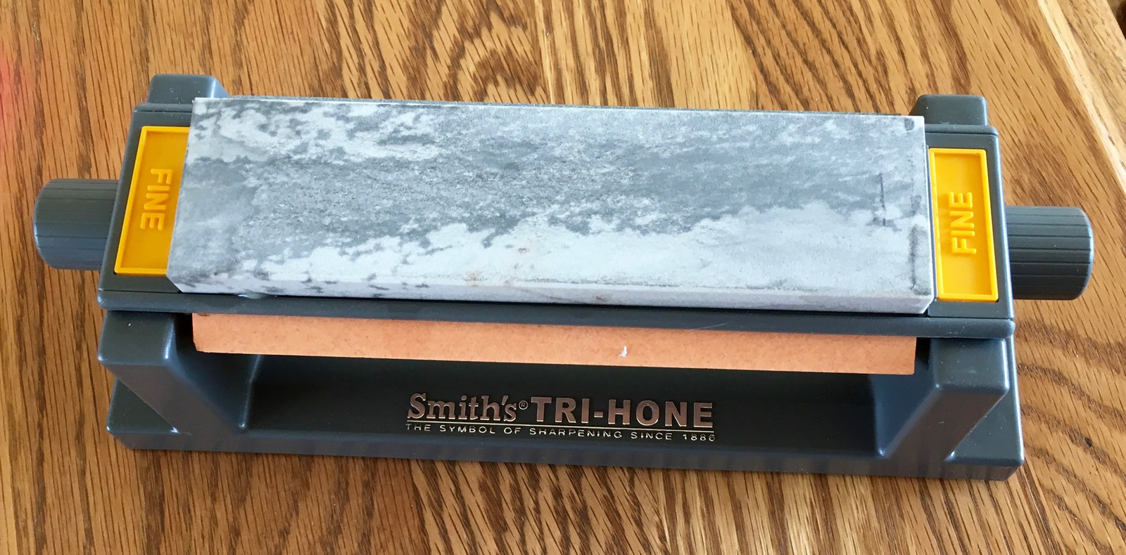 Once you have the angle roughed in with a file, get out your sharpening stones. If you don’t have a sharpening stone, the Smith’s Tri-Hone is less than $30 on eBay and is great for things like this. Start with the course stone, and give your new knife a great edge. Start with the course, work down to the fine, and when you’re done, you should have a putty knife with a brutally sharp edge on it. This is not a toy - if you’ve done it right, it’s a properly good little knife!