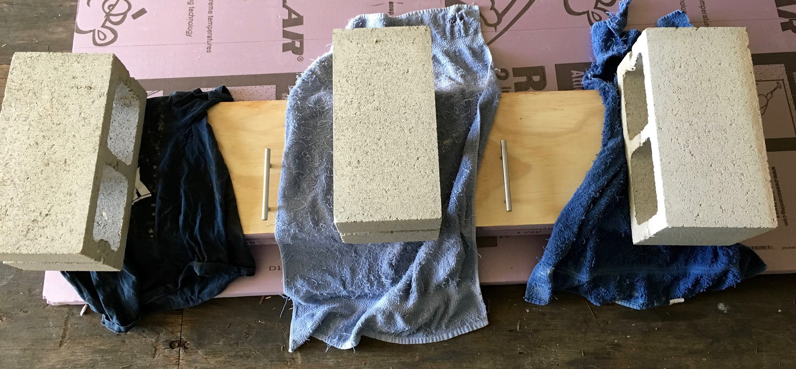 Make sure the glue you’re using is compatible with foamboard - some of the glues out there will eat foamboard, but most of the better ones are fine. With the handles mounted, I put a bunch of glue between the foamboard layers, and between the plywood and foamboard. Some handy cinderblocks (seriously, these are always useful to have around) serve as the clamp weights, and then it’s just a matter of waiting!