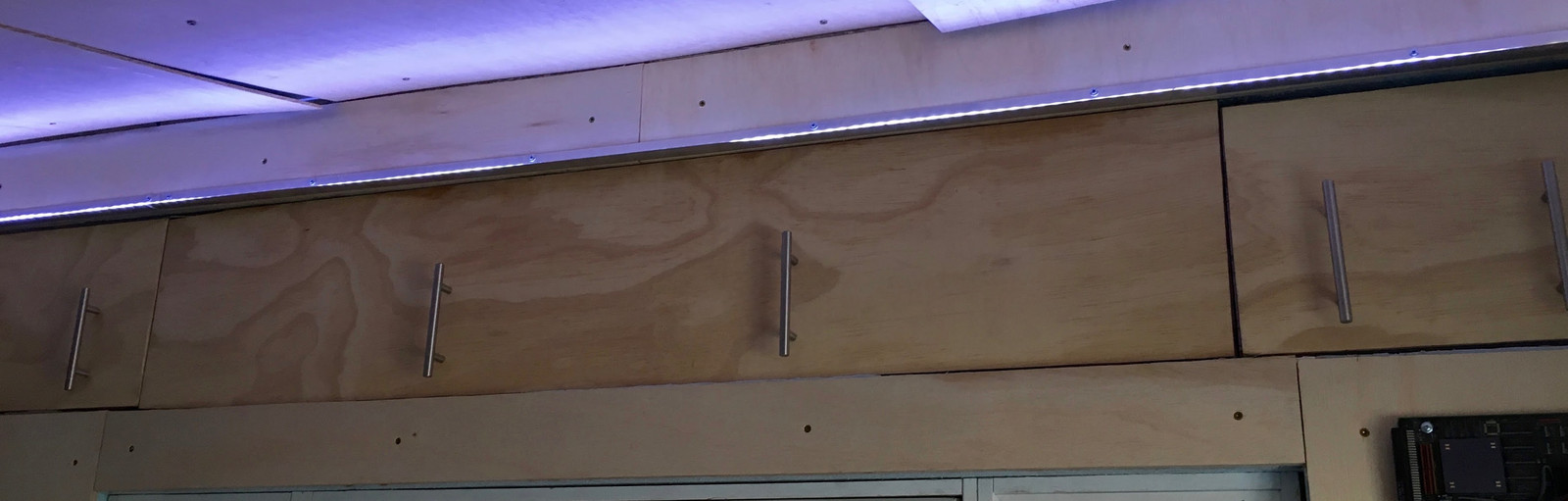 For the summer, I plan to stick a few old hard drive magnets on them and hang them on the ceiling against some iron bars screwed into the plywood. Out of the way, and I don’t have much else hanging from the ceiling yet (just a shop lamp over my lab bench).