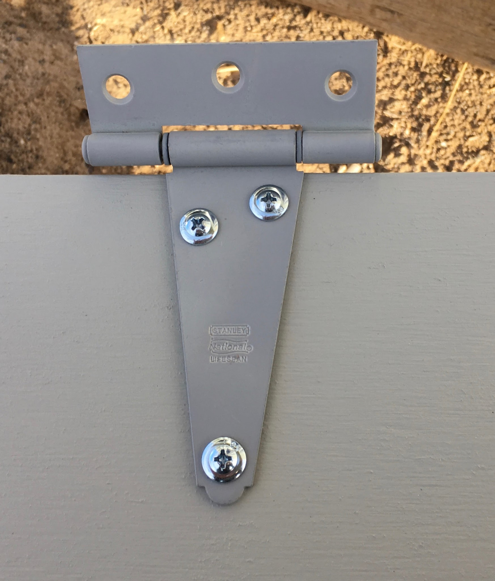 The screws I’m using to hold everything together (at least on the plywood side) are some lath screws. They’ve got super wide heads that mean they’re basically a washer and screw combined. I have no idea if they’re intended to be used for things like this, but they work, and I’m in a very dry climate (look at all that dry dirt below the hinge), so I expect they’ll be fine.