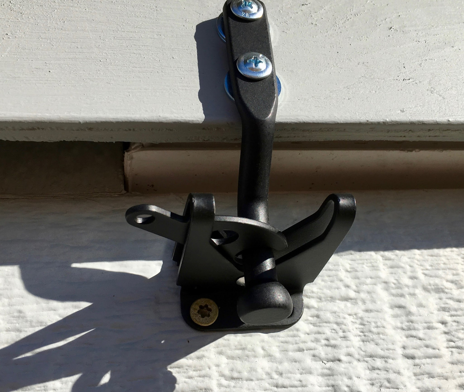 Unusually, I’ve got my gate latches facing down. Because the shutter is slightly shorter than the total length of the windows (my goal was to block enough light to avoid melting things, which didn’t require the extra two inches on each side), it’s a long reach on the ends, and it was going to be really difficult to line everything up.