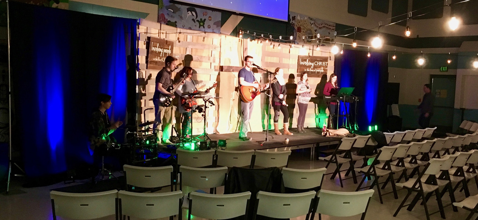 For white fixtures, we’ve got two spots that shine on the stage in the back, and then the congregation lights - overhead lights that provide light for reading and note taking (the lights hanging on the string on the right).