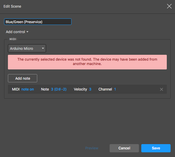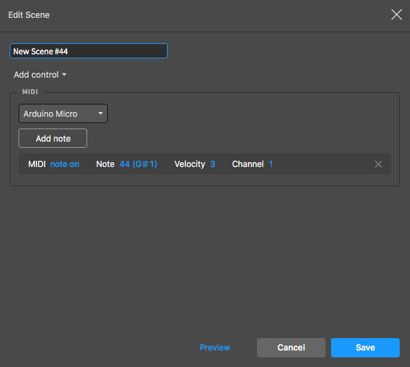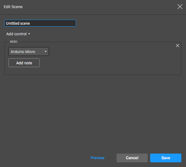 In any case, to add a new scene, you’ll click the “Add scene” button, click “Add Control,” select “MIDI,” and then select the device - normally Arduino Micro, though you could change the name if you dug around deep enough. On Windows, you have to plug the MIDI device in before starting Proclaim, or it won’t detect it. On OS X, it shows up fine if you plug it in after starting Proclaim.