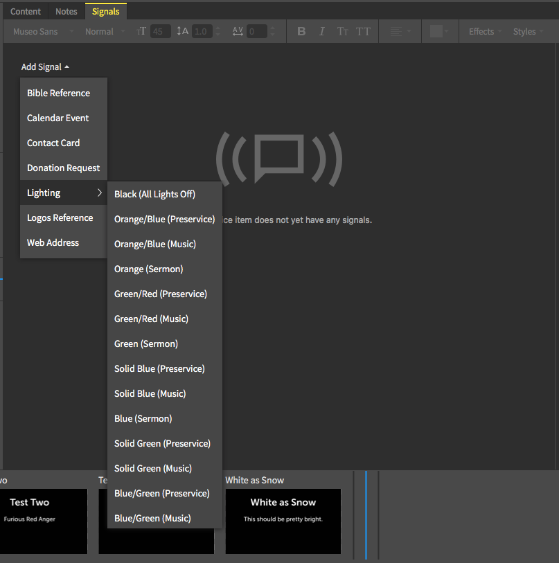 Proclaim’s lighting interface isn’t great, but it’s what they offer. And it does work - it’s just a bit cumbersome with large numbers of lighting scenes. There are a few different places one interacts with lighting in the software - the settings menu for configuring lighting scenes, and than the signals tab of each slide, for applying the scenes.