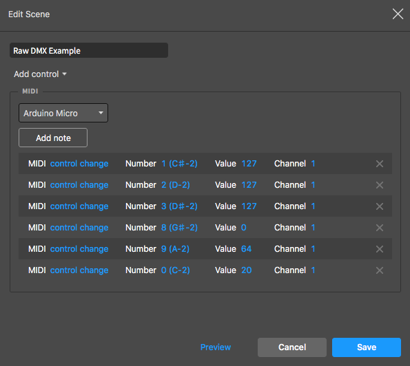 - The “Note” field is the scene ID to select. You’ll get this data out of the scenes.h header file that’s programmed into your particular board.