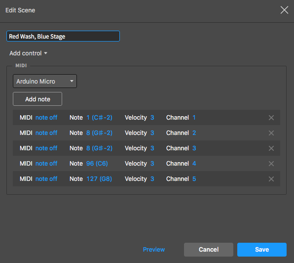 If you have lighting hooked up, you can use the “Preview” button at the bottom to send the current note and verify that the scene you want comes up. The “Preview” button is also a good way to select something sane if the lighting is in a weird state from last time you used the controller, since it recalls the last state and restores it.