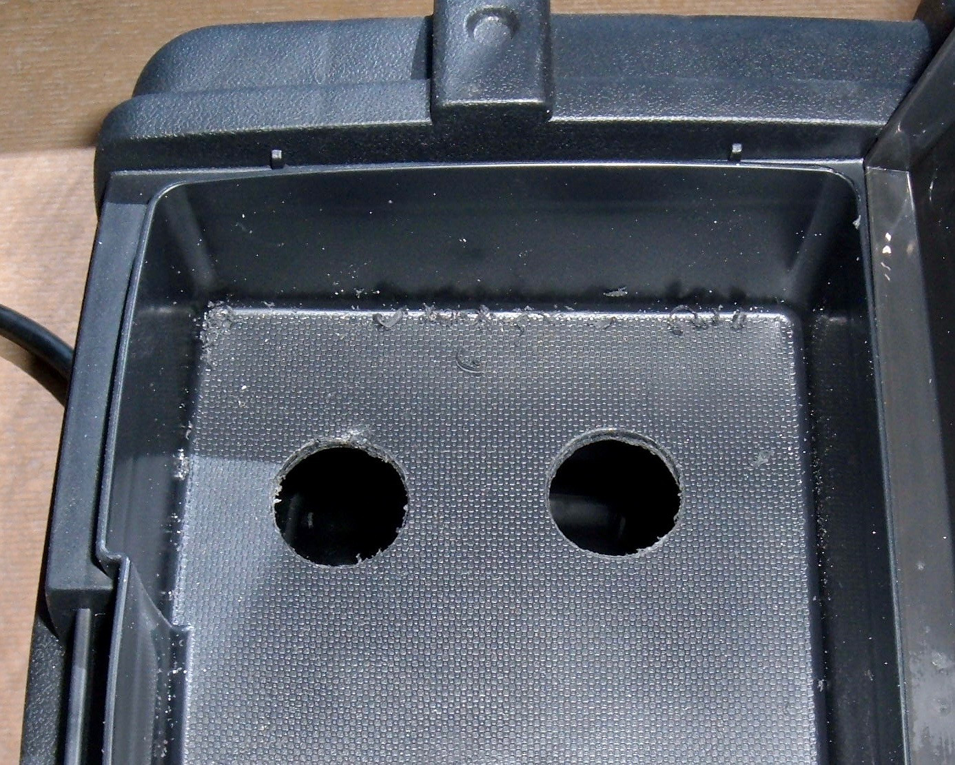 After poking around with where I wanted things, the first step was to bore some holes in the top compartment for the 24V outlets. These are matched, rather nicely, to the outlet size, and the outlets just push right in. It’s a tight fit, which is perfect. Use a hole saw that matches your plugs.