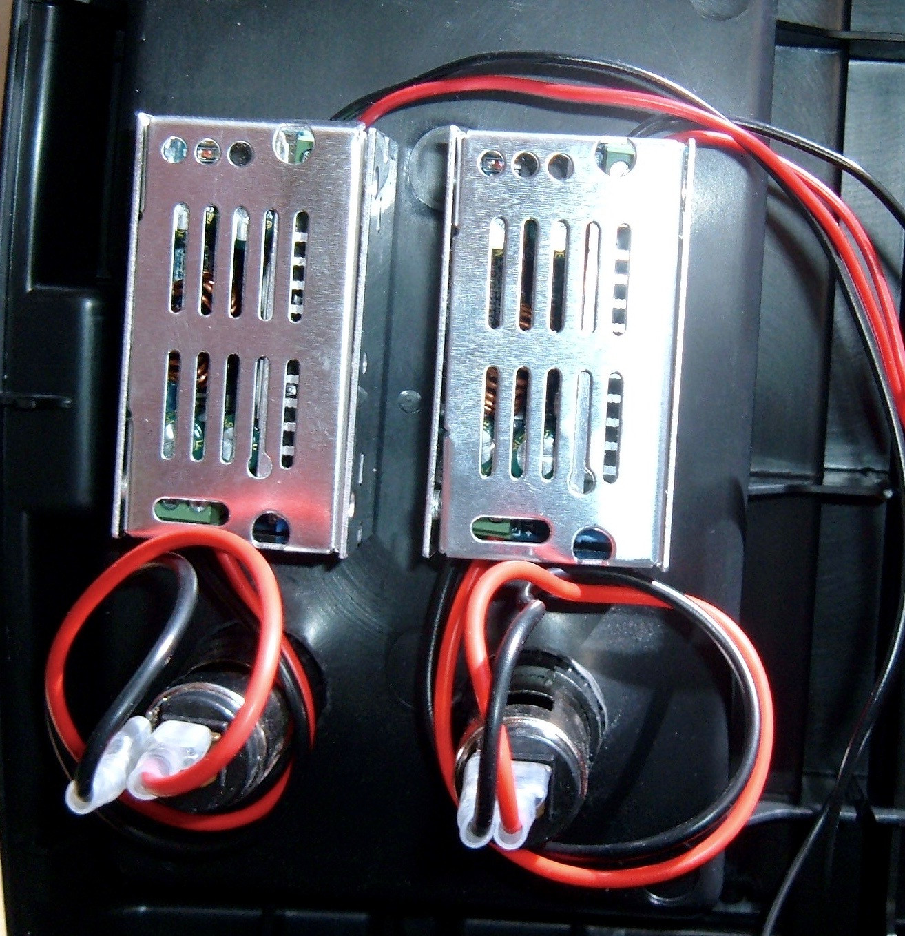 Press the outlets in, and I’ve got a pair of badly mislabeled power outlets. These are not 12V (they’re about 28V), and they’re not 120W (the buck converters are rated at 15A Chinese, or about 7.5A in reliable reality, so about 210W per outlet). That’s more than enough to run my hardware.