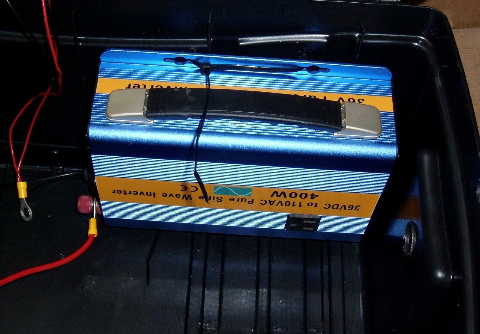 I found a great little inverter on closeout sale for my 120V AC output. It’s a 400W unit that works on 36V, and is a pure sine wave unit, at that. Awesome. The cheaper inverters are all modified sine wave, which basically means, “Square wave with some time at zero volts in between.” The fancy ones are pure sine wave, and that works much better with a wider range of devices.