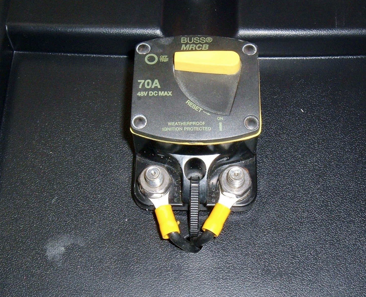 The various bits and pieces do have some idle power draw, so I wanted a big switch to turn power entirely off. I’m a huge fan of mechanical power disconnects, because they get rid of all the idle draw and you’re left with battery self discharge. So, I’ve got a nice circuit breaker on the negative side (not that positive side or negative side really matters for a floating system like this - there’s no ground reference). This is hung outside, on the front of the box, so I can easily turn the system on and off. It would be a good idea to insulate the connectors with hot glue or something…