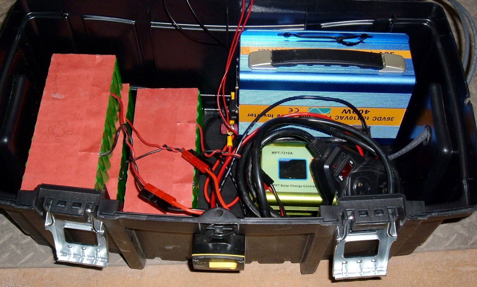 So, that’s my power toolbox! I can hook up the solar panel to charge, or just carry the toolbox around for power without solar (nearly a kWh of power will last me a long while when camping).
