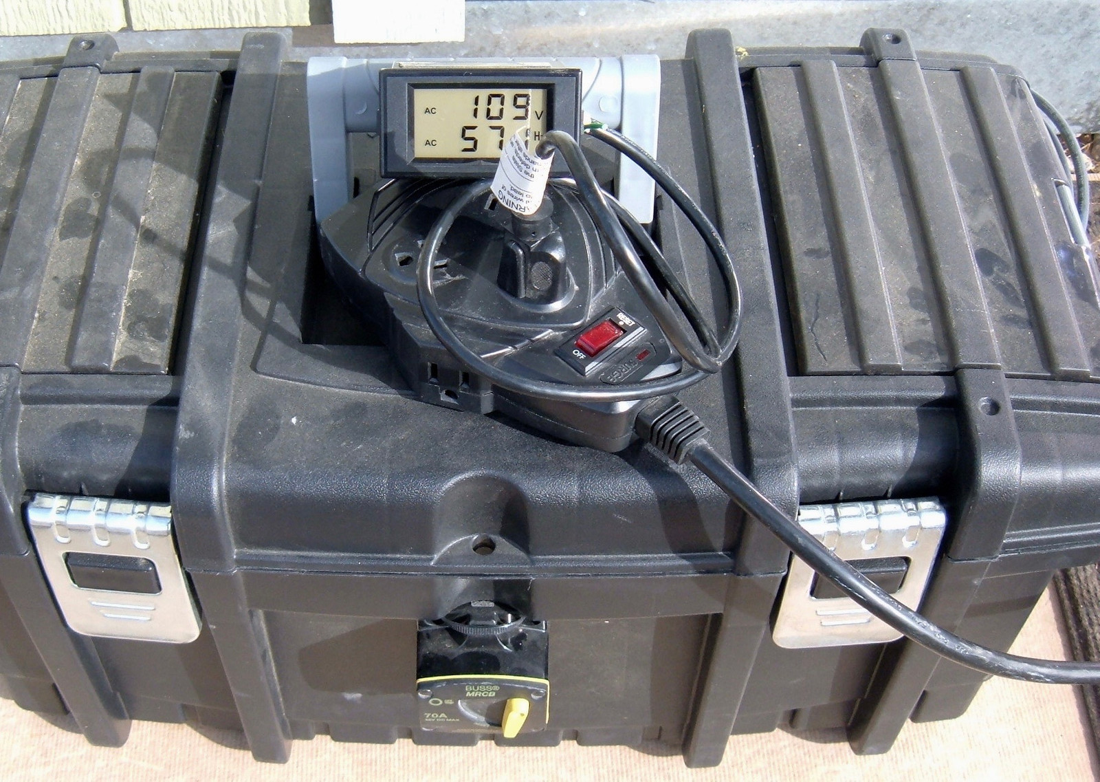 Despite being labeled as a 400W inverter, it will tolerate a good bit more wattage for a while. I can run a 650W heater on it, without complaint (though it trips off if I set the heater to a 1500W setting). Their newer 500W inverter is rated for a peak power of 1000W, so I’d guess peak power on this inverter is around 800W. Whatever it is, it’s plenty for my needs (though it’s not going to run a circular saw). The voltage is on the lower side of what I prefer (110V under load), but it’s acceptable. Ignore the frequency readout on my little gizmo - it’s wrong.