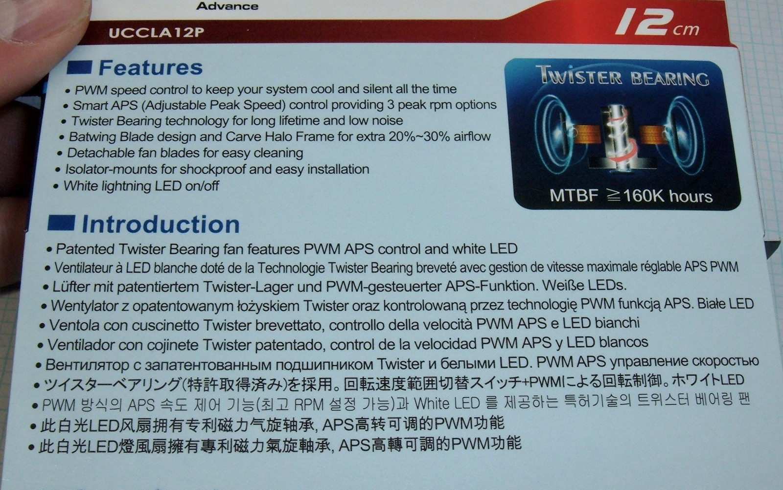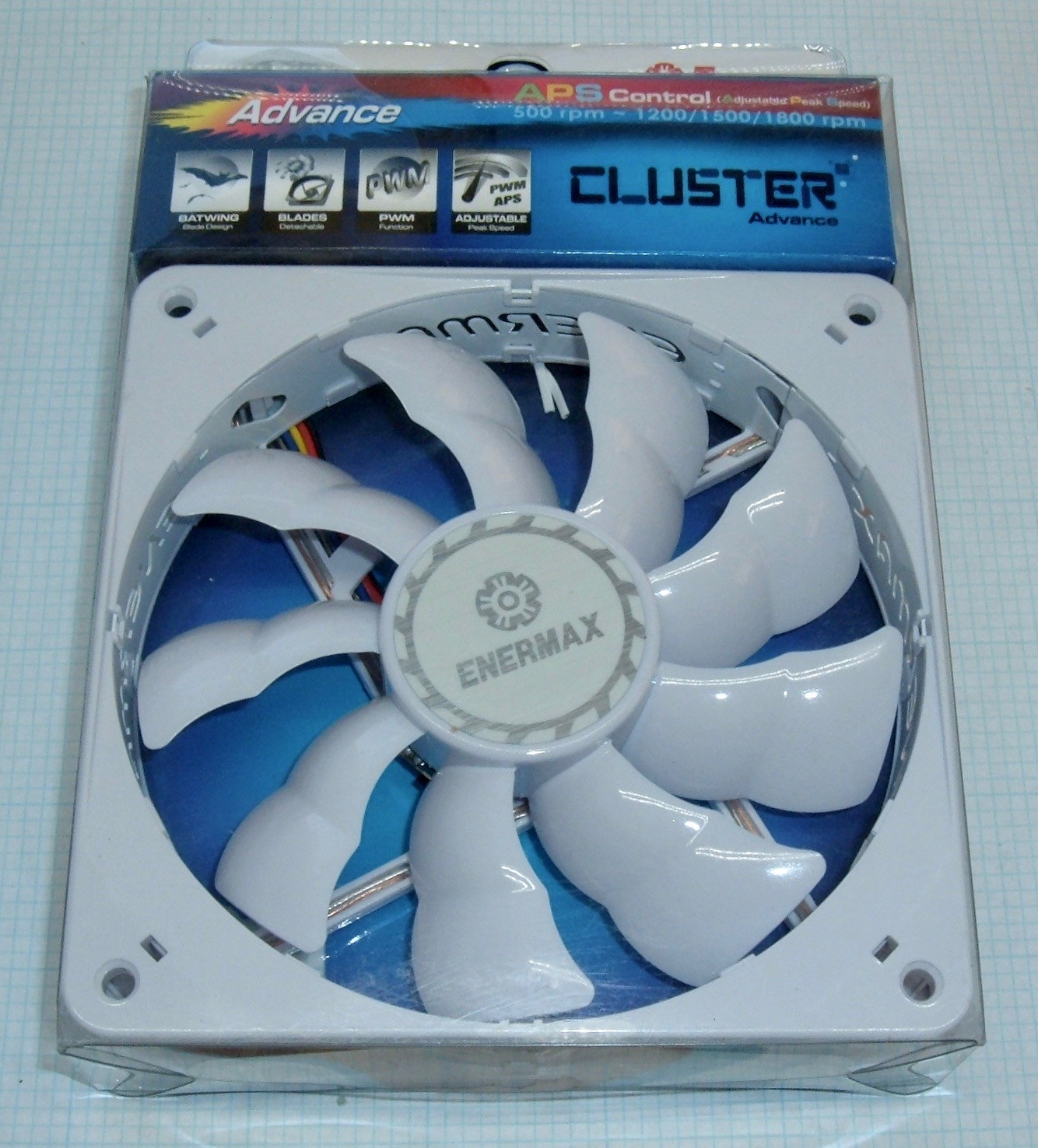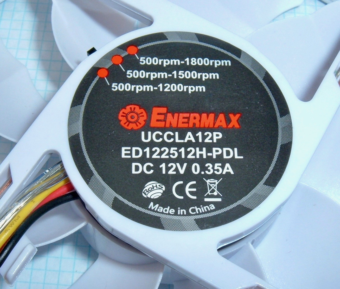 What I found is the Enermax UCCLA12P (I got mine for $9 on eBay, shipped). This fan has a RPM control switch that limits the maximum RPM, which limits maximum current draw. It’s also got a bunch of white LEDs that I don’t particularly care about. I think.