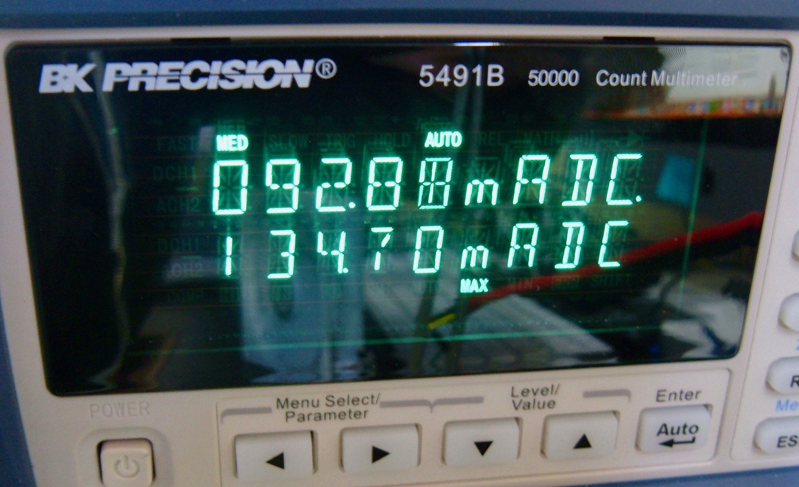 To find out, I wired it up to my bench multimeter. This is an absurdly nice unit with helpful features like max current logging, and it’s fairly accurate (I really need to take it in to be calibrated).