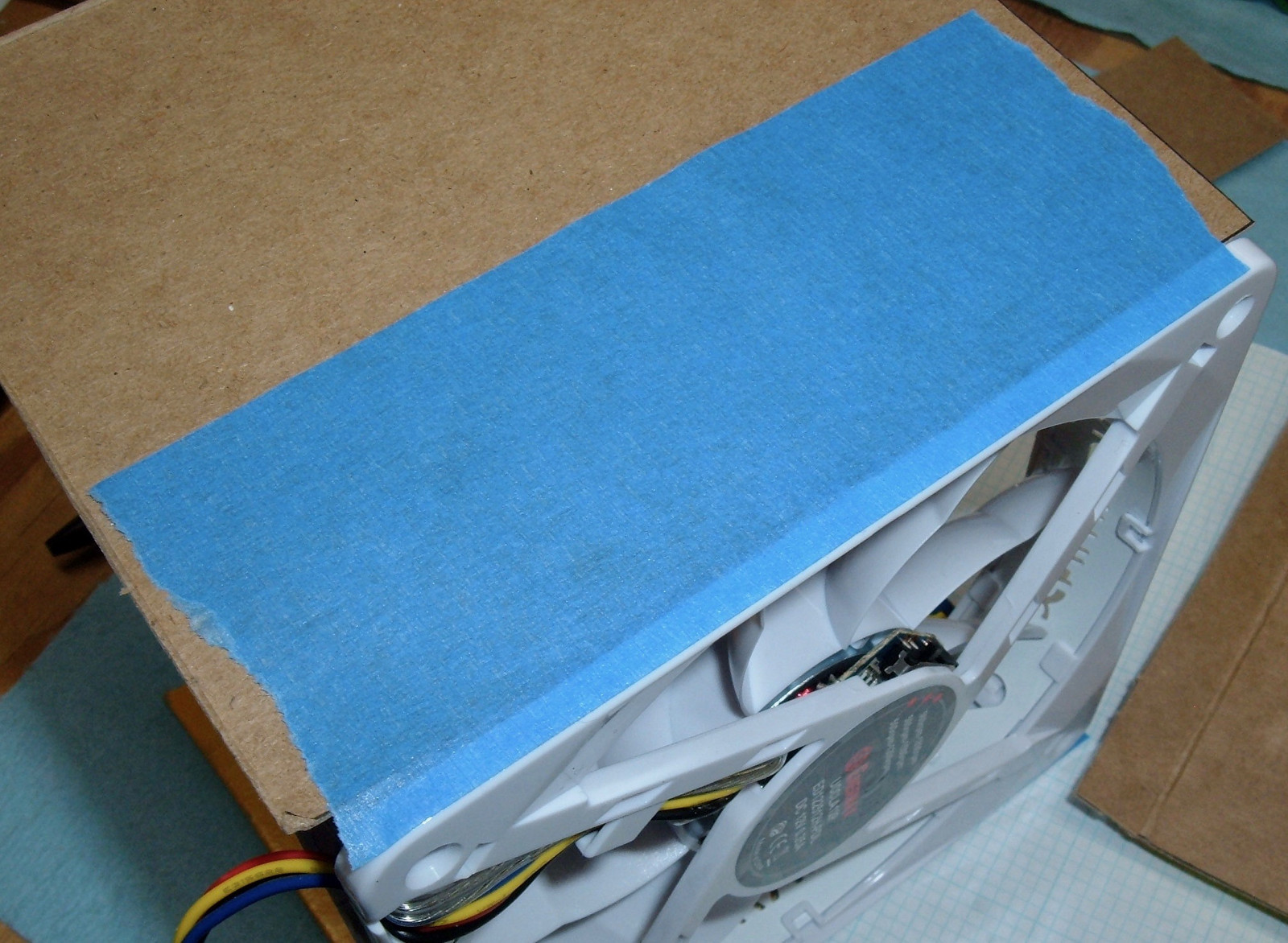 After playing round a bit with how to secure the fan to the cardboard, I worked out that I could use my blue painter’s tape on the edge of the fan, with the chipboard butting up behind. It works well, and is a good bit more solid than it looks like it should be. Since the fan will be secured on all 4 sides, I’m not worried about it going anywhere.