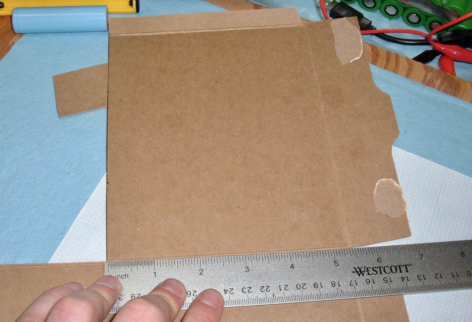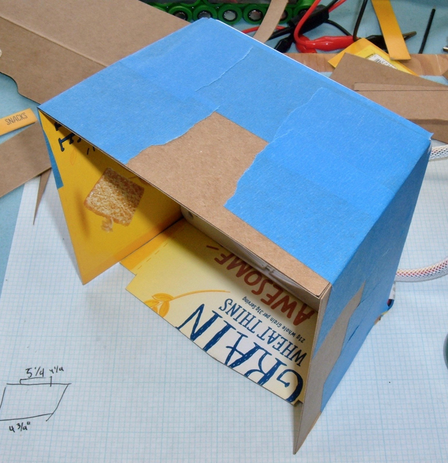Next, I decided how I wanted to mount it. Since this is a prototype, I went with a proper prototype construction method: Chipboard. The thin, single layer stuff you find in cereal boxes and cracker boxes is perfectly suited to building simple structures like this. It’s easy to cut, easy to tape together, and is actually quite strong if used properly. Mark and cut. A good metal ruler is a useful thing to keep around.