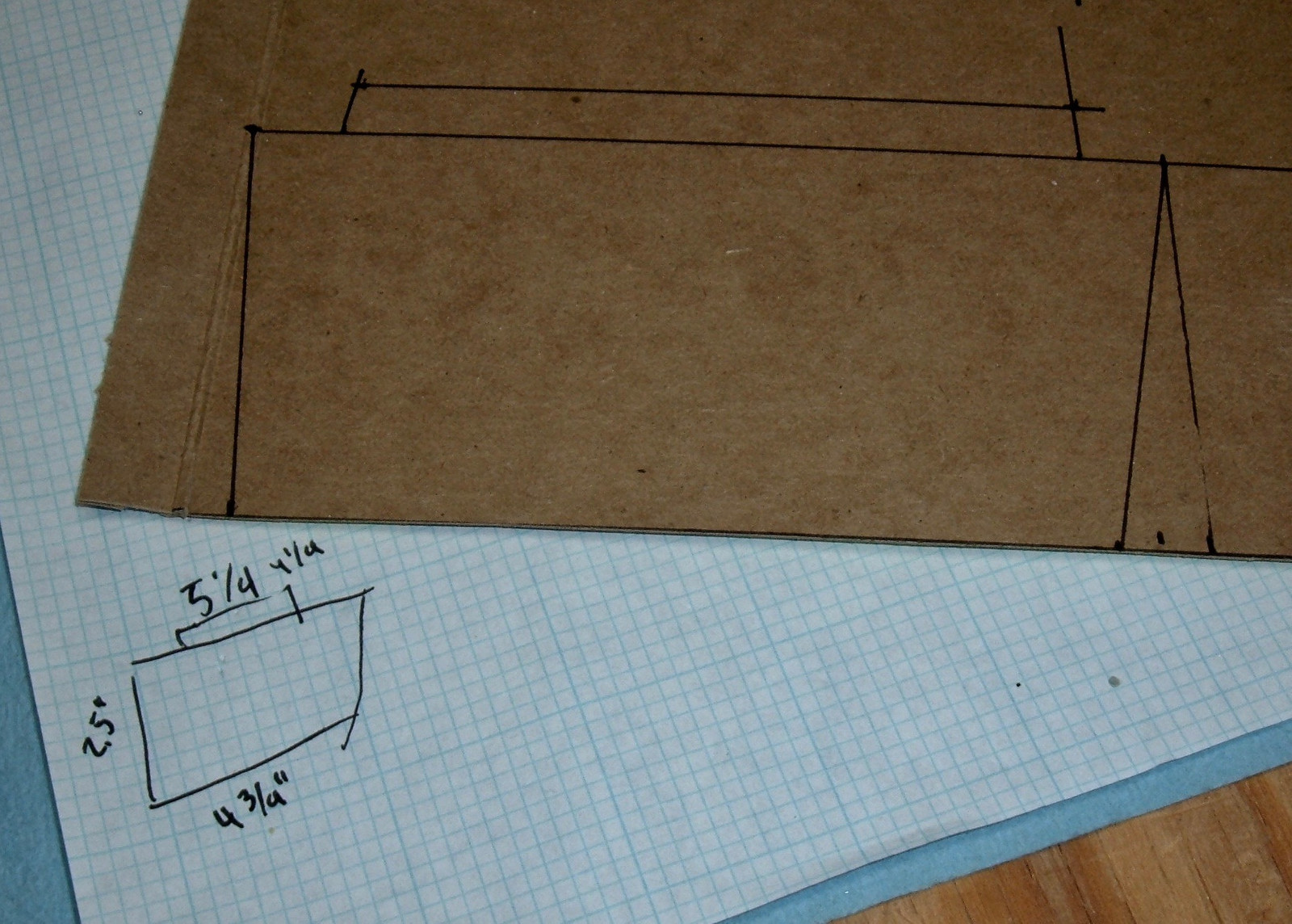 The sides are squares, but the bottom is a bit more complex. I can slip the chipboard in the gap above the remote console if I try, and that gives me a nice strong base to support the fan vertically. A bit of diagramming, a bit more marking, and some cutting gives me a useful shape to slip in as the lower support.