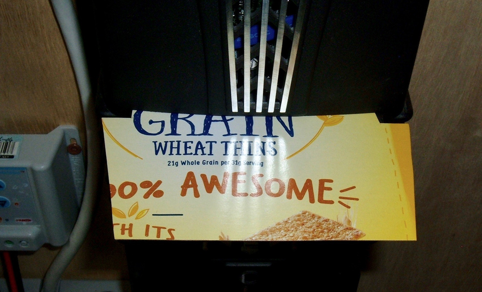 You can guess, perhaps, what sort of snack my building material was from. The board fits nicely in here, though I had to trim the left side a bit to clear a latch.
