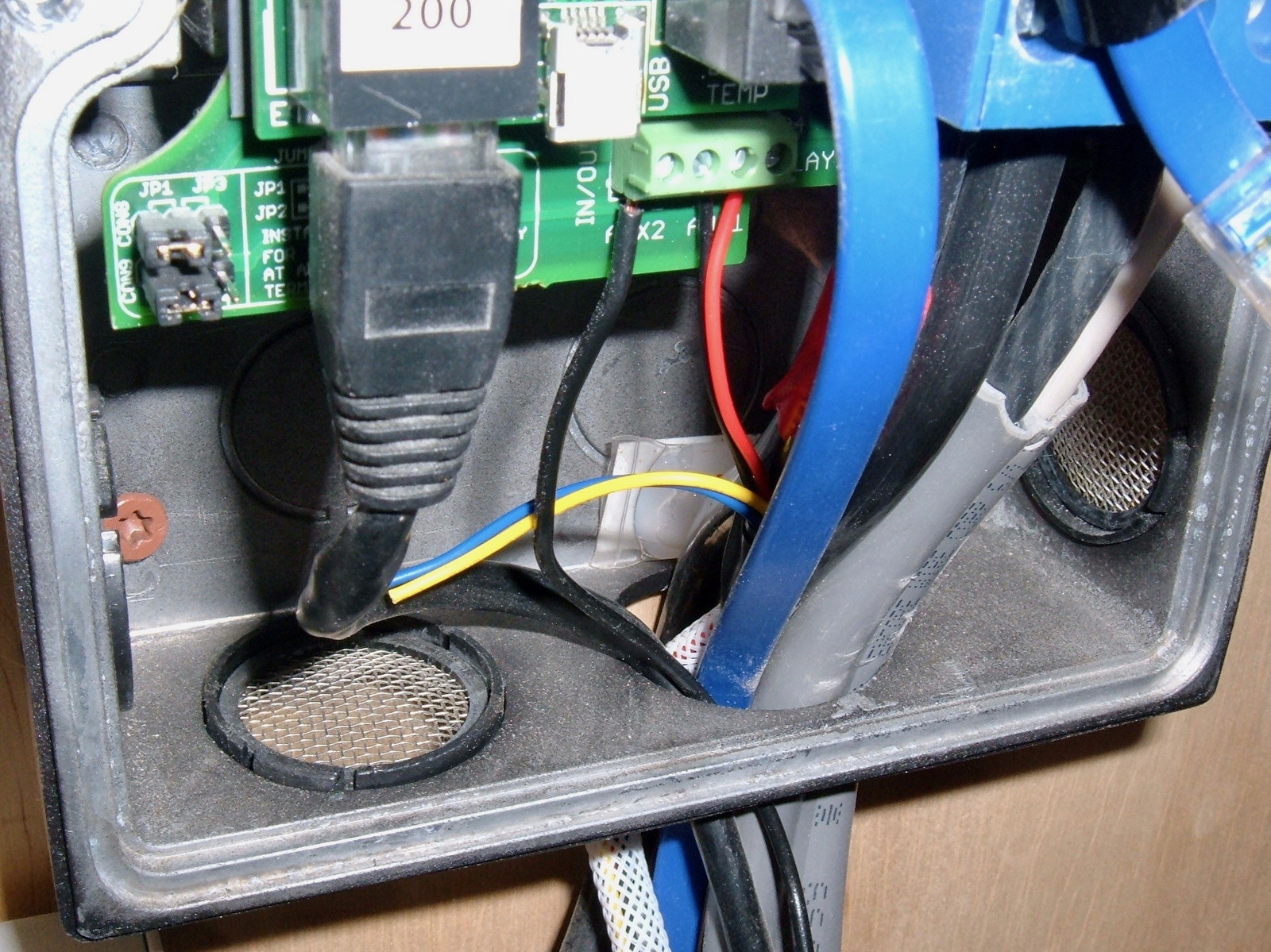 Shove my two tinned wires in the AUX1 terminal block, and I’m good here! That hole is increasingly full of cables. I’ve got solar in, battery charge out, ethernet, temperature, fan, and WhizBang Jr (a single wire connection to AUX2) going through there - it’s almost out of space.