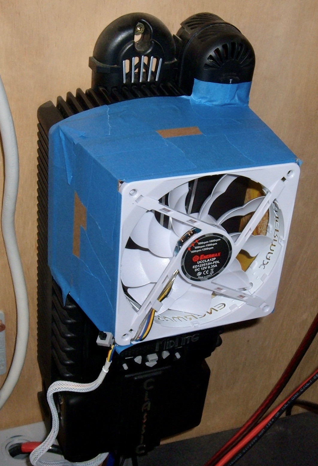 The internal fans do spool up on occasion if I have full sun and a lot of demand (so lots of power flowing through the unit), but this doesn’t bother me nearly as much, because if I’ve got solid sun, I very likely have my Folding@Home/BOINC desktop running. If that’s running, the fans in that PC make some noise, and the AC current draw is high enough that the inverter fan is running. So the charge controller fans don’t really stand out and I don’t mind them as much. The goal was eliminating the silent office fan noise (which is mostly an issue on cloudy days), and this does the trick.