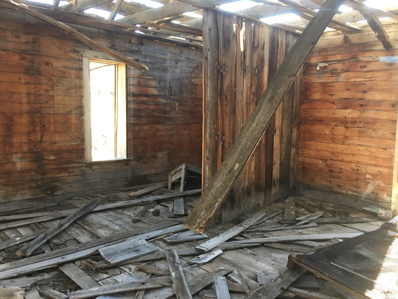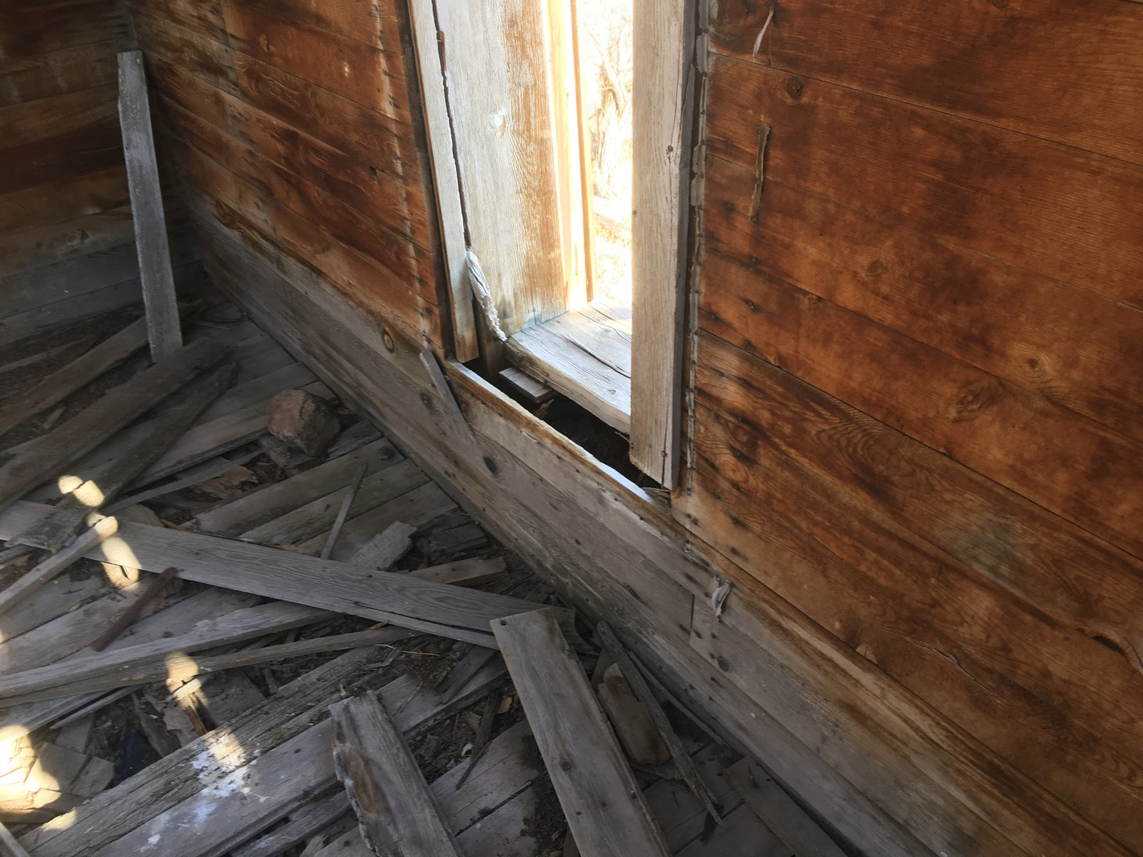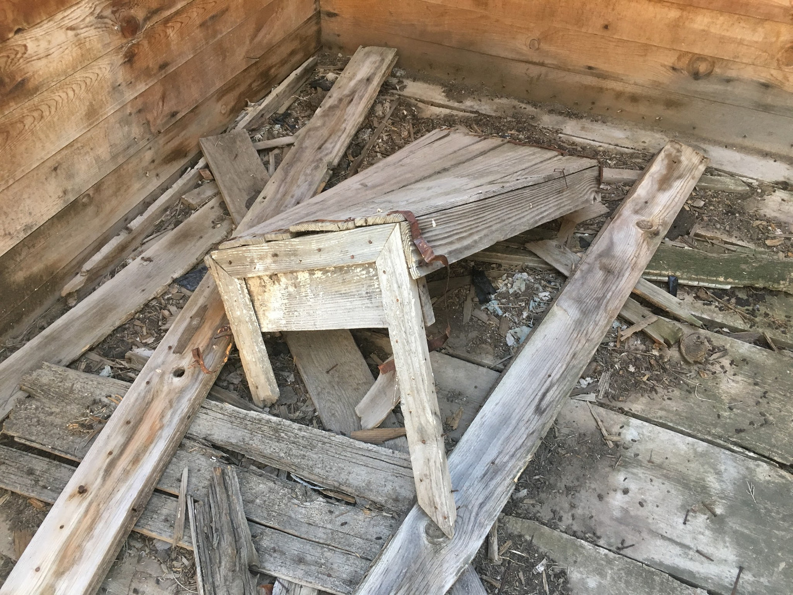 This bench hasn’t held up particularly well to the test of time. I don’t think it was built into a wall - I think it just eventually collapsed. Possibly from getting crushed by ceiling wood, possibly just aging. I’m really not sure what the failure here was, and I wasn’t going to poke around at it to find out (I didn’t particularly want to disrupt how things had fallen).