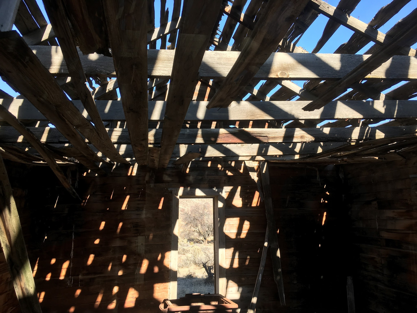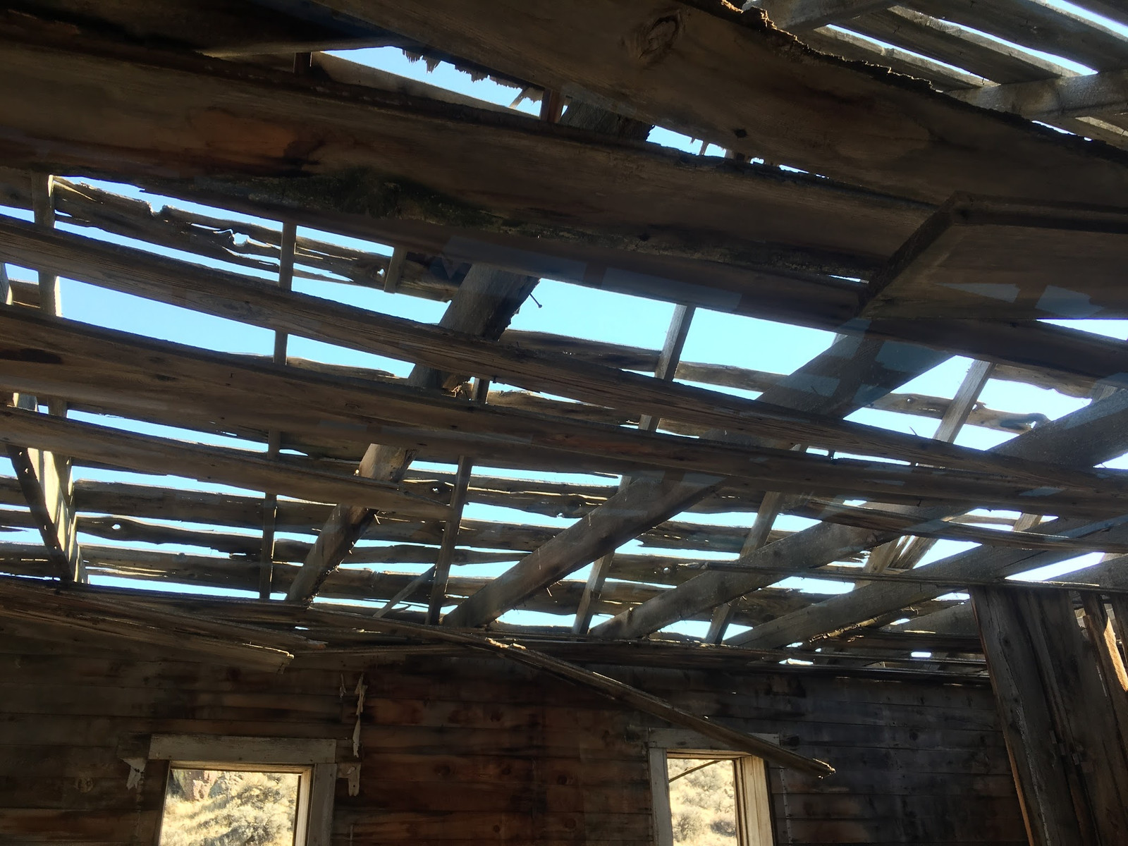 The roof is no anything that resembles a “roof” - it’s just a bunch of separated boards that have huge gaps between them. I have no idea what the original roofing material was - it may have simply been wood planks overlapped. However, on the inside, the cabin had a flat ceiling at one point. Many of the boards have come down, but it was a full ceiling, at one point.