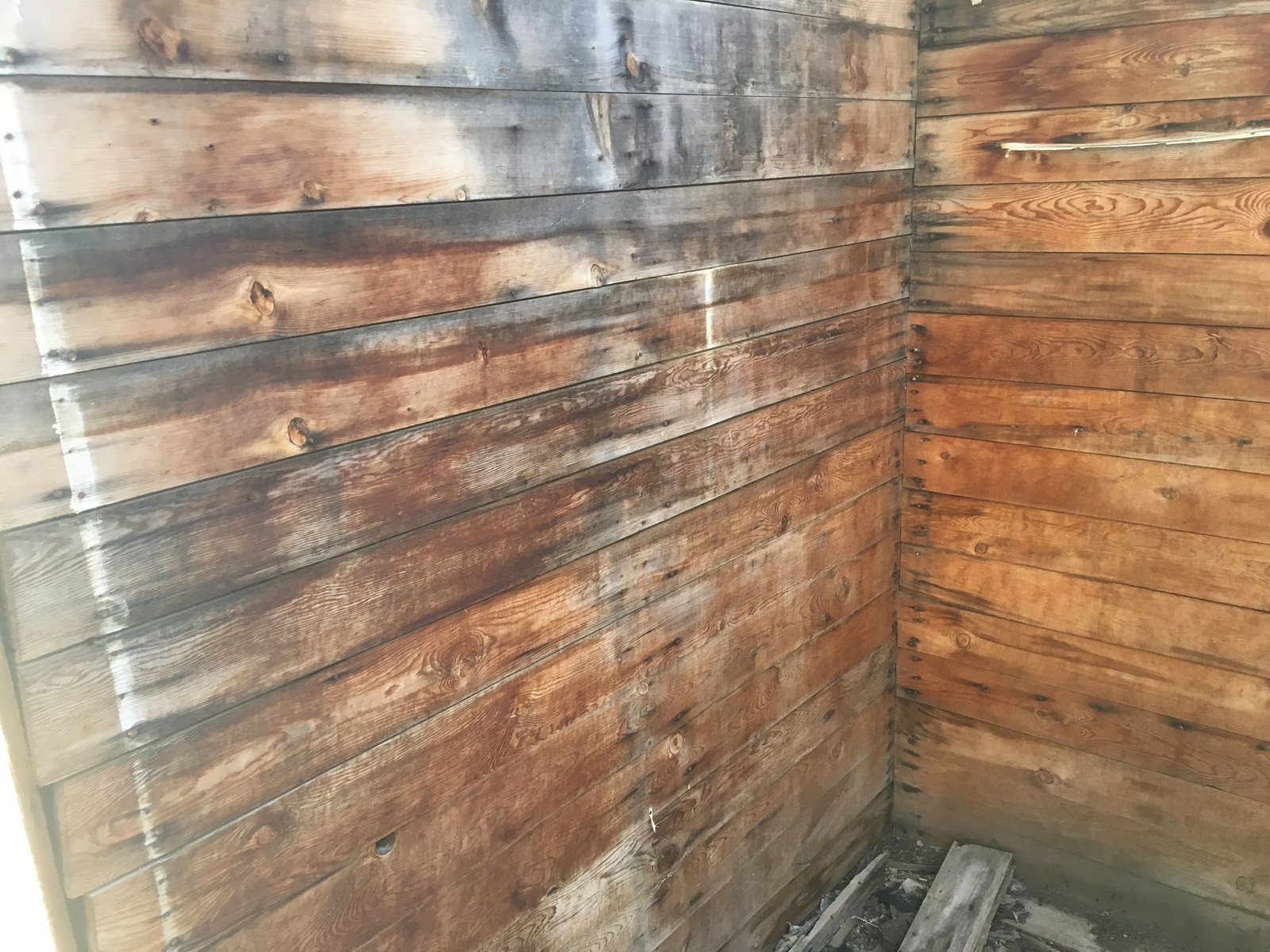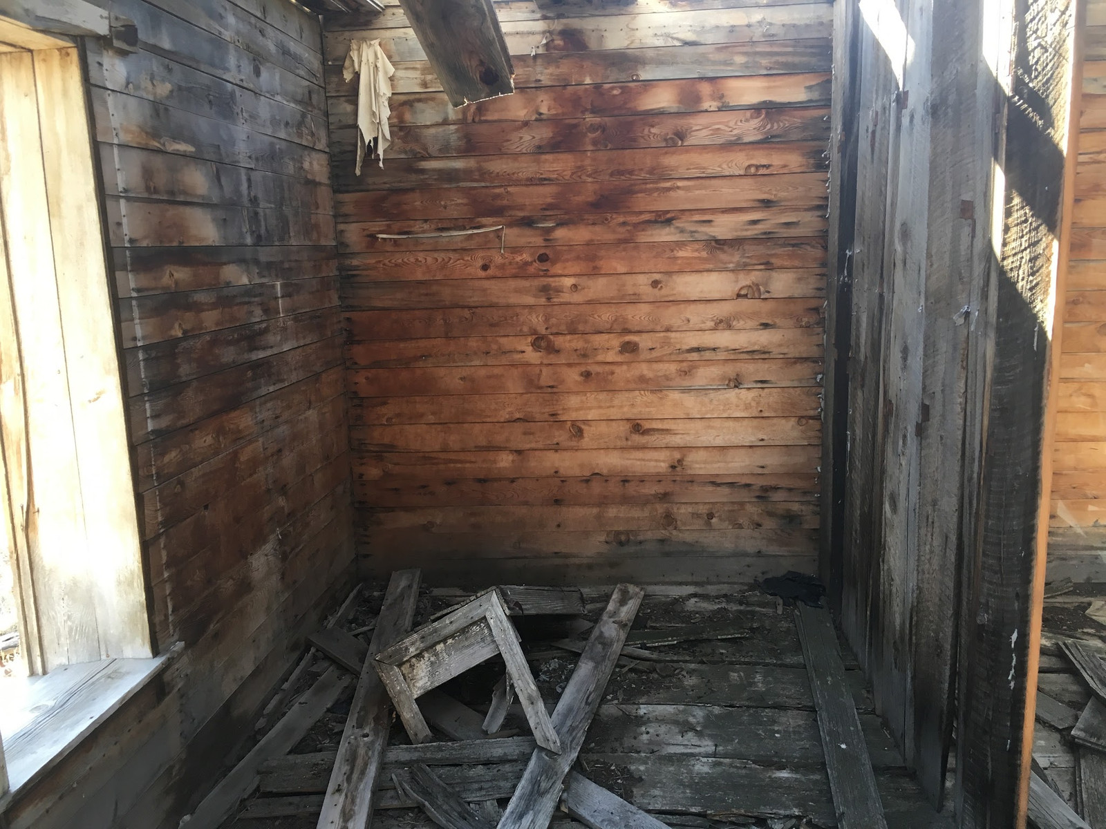As far as I can tell, the cabin started as a single room log cabin with an addition added out one end. The main structure (that’s still standing) is an interlaced log structure with siding on the inside and out. The extension that’s collapsed is a more modern construction, with normal studs and walls. There’s no insulation to speak of beyond the logs in the main section. Given where this cabin is, I expect it was pretty cold in the winter!
