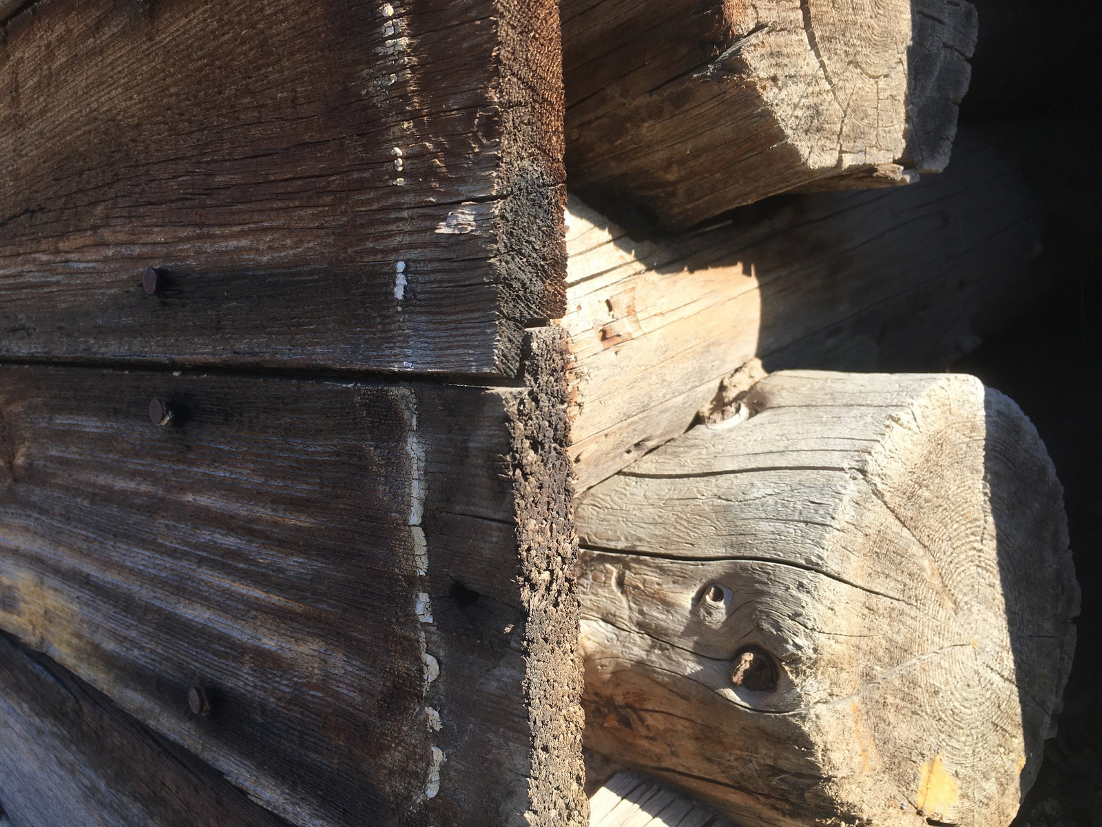 Despite the overall rough condition, the exterior walls attached to the log framing are in great shape! The wood is very obviously ancient, but it’s still solid, securely attached to the frame, and still seems like it would keep out the wind and rain. If, of course, there were a roof.