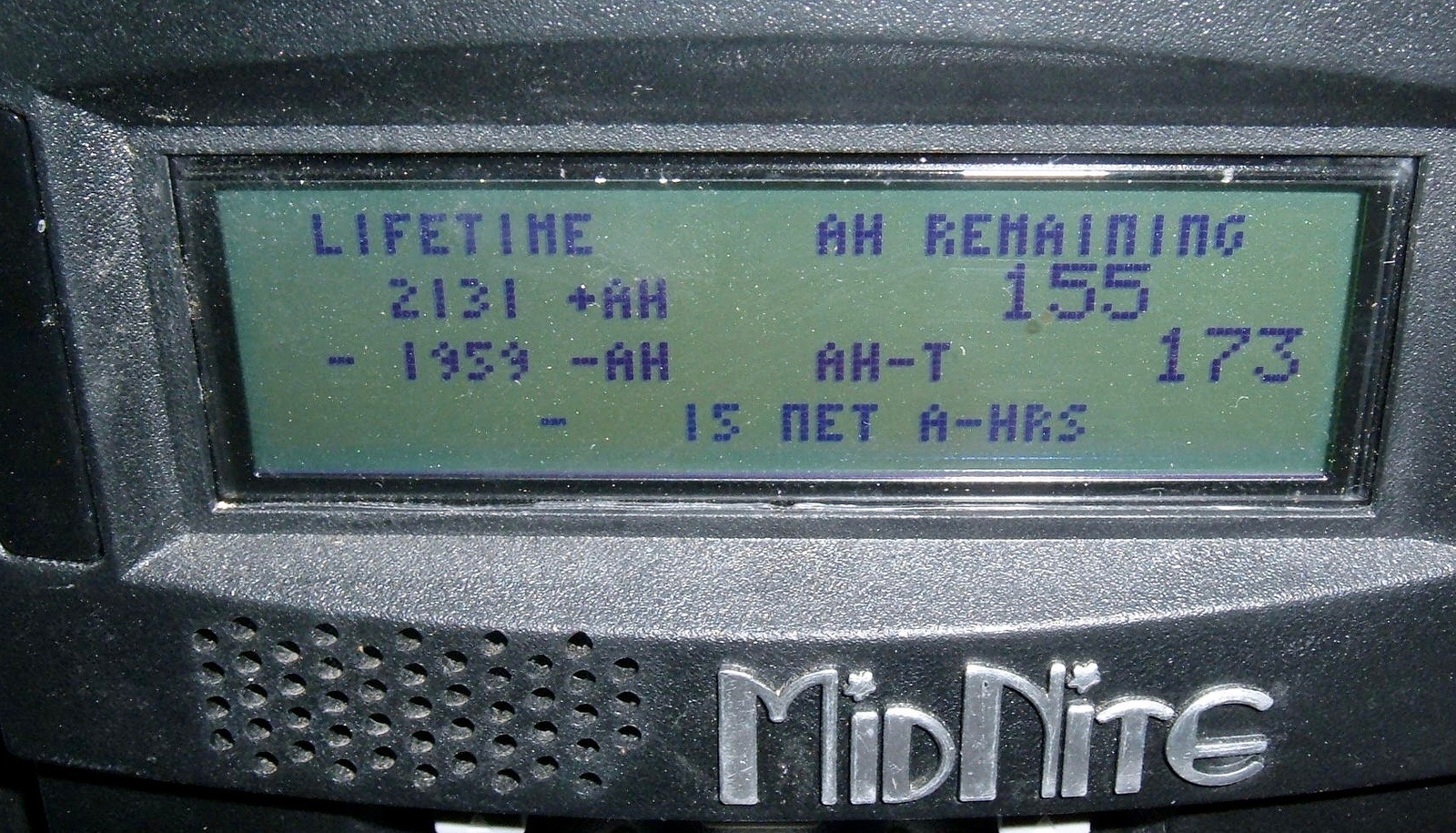 Another really nice feature of the Whiz Bang Jr (and other similar units) is that they allow you to see the net charge on the battery - it allows counting amp-hours in and amp-hours out to get an idea as to the battery state of charge. I really, really like this little gizmo.