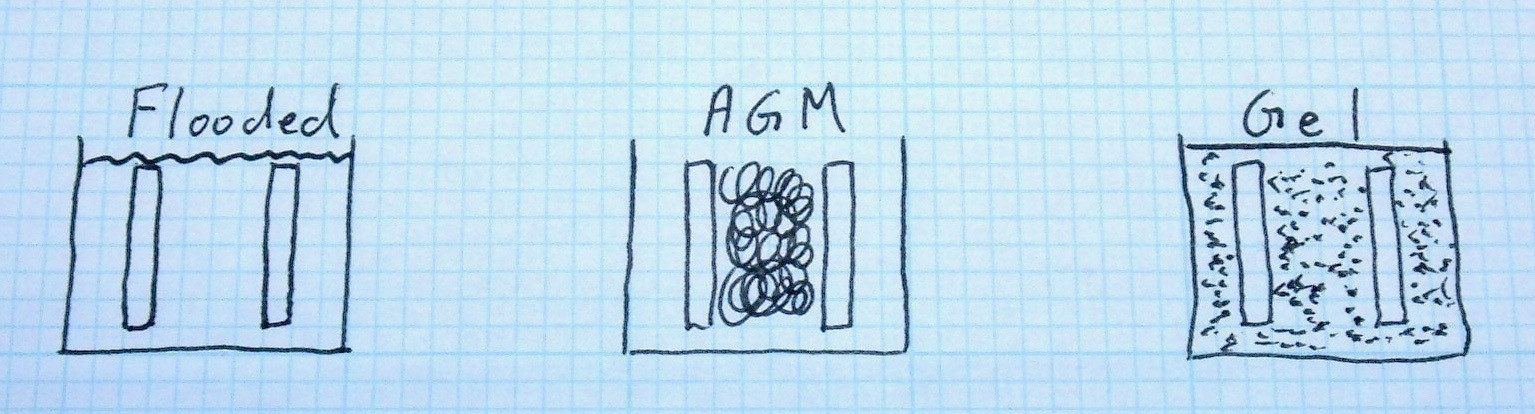 There are three main categories of lead acid batteries on the market: Flooded (FLA), Absorbed Glass Mat (AGM), and gel. They all use lead plates and sulfuric acid, but the nature of how the lead and acid interact differs rather dramatically between the three types.