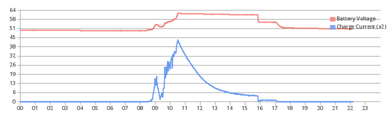 However, if you have enough panel, or the bank isn’t very empty, the absorb stage can end before the sun goes down (as it did here). Absorb ending can be determined by specific gravity, or by the charge current into the bank. When it ends, you’ve got a few options. You can turn the charger off entirely (and run on batteries, despite there being good solar), you can stay up at absorb voltage (gassing the batteries, going through water, and corroding the positive plate), or you can drop down to float voltage (which is what you should do).