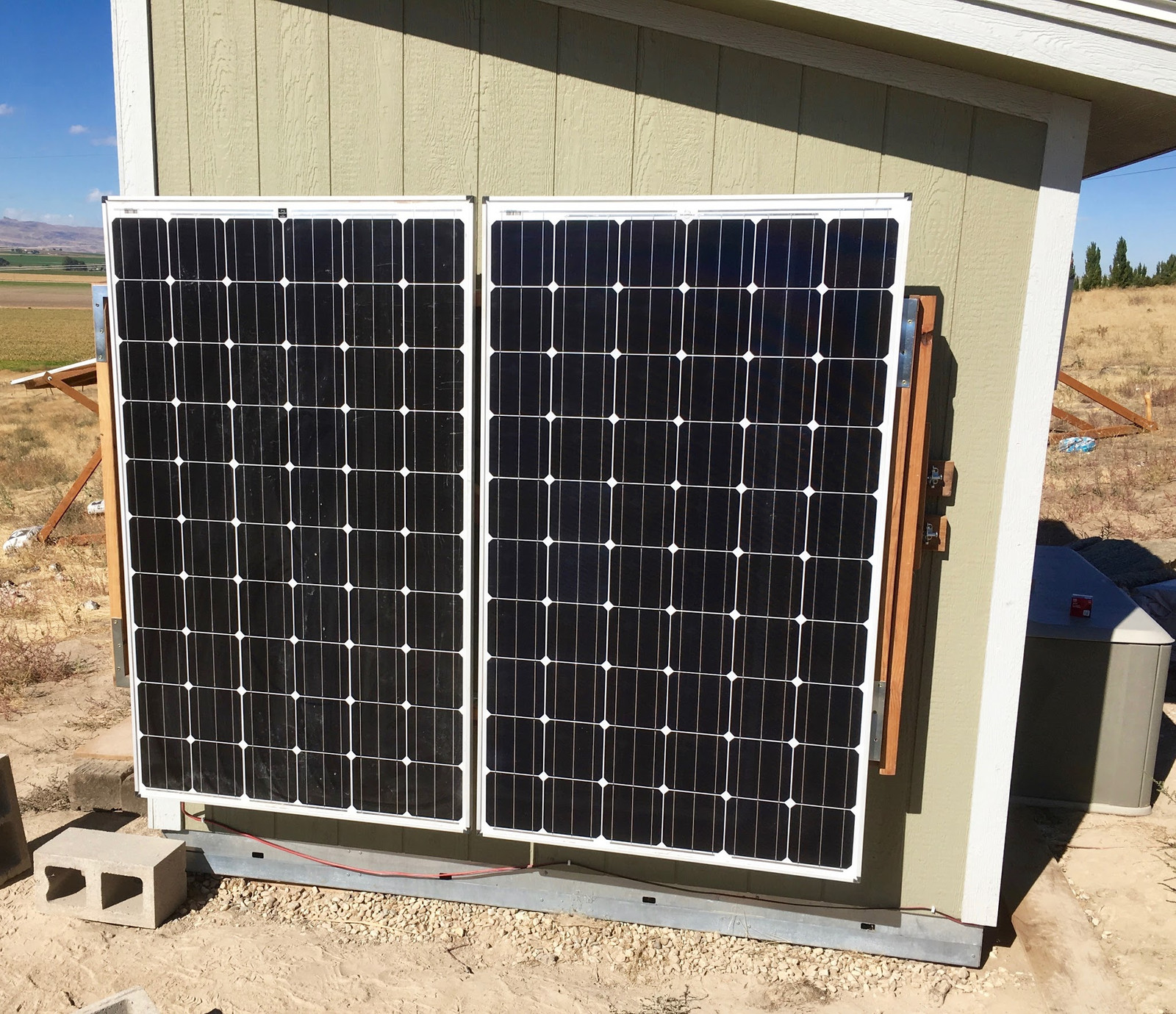 After I built my main solar arrays, I had two panels left over, and for lack of any better ideas for them, I built a set of “morning panels” on the east wall of my shed. They swing south if needed, but mostly they sit docked on the wall and soak up the morning sun.