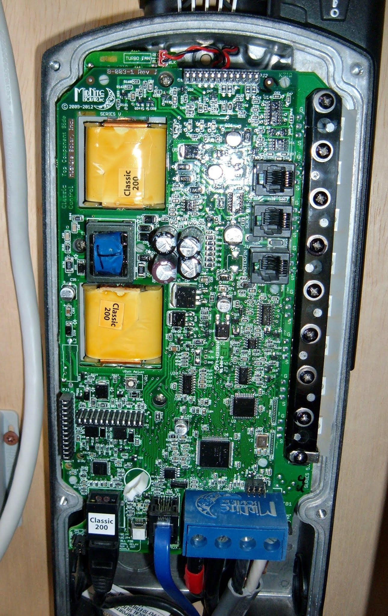 Look back at the diagram. The top of the power curve is called the “maximum power point” - for what should be obvious reasons. That particular voltage/current point is the absolute maximum number of watts you can get out of the panel at this particular point in time. A more sophisticated charge controller can track this point by sweeping across the range of voltage/current values and finding the maximum power. My main array of 8 panels is hooked up to a MPPT charge controller (a Midnite Classic 200, which runs around $600). If I load things up enough to get them at max power point, they’re operating at about 116V/13.8A/1600W (two strings of 4 panels in series instead of one string of 2 like my morning panels). It’s a good solar day. The MPPT controller converts that power into what my battery bank (and the rest of my system) wants - about 27A at 59V. This is the insides of a Midnite Classic 200, and it’s a fairly complicated bit of circuitry (this unit can handle up to 4500W of panel on a 72V battery bank). This is only doing the maximum power point tracking and DC-DC conversion - it’s not even outputting an AC waveform!