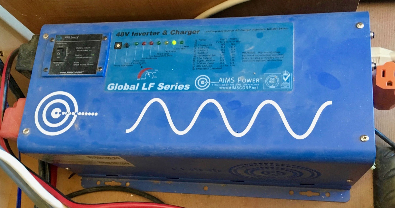 An off grid system typically has two different devices - a charge controller (the Midnite Classic shown above) and an inverter (sometimes more than one of each in parallel). These are separate devices, and cost a good bit more than a microinverter of comparable power. But, they also work with the battery bank, and have to deal with more amps. A 320W microinverter will typically consume around 10A on the DC side and output about 2.5A on the AC side. My charge controller tops out around 75A on the battery side, and my inverter can pull 125A from the battery bank (peak current). I’ve got a massive low frequency inverter that weights about 40lb (for stationary use, I consider power density in inverters an anti-feature - I’d rather have a massive inverter than a tiny one, because they tend to last a lot longer). My inverter is rated at 2kW, but can source up to 6kW briefly if needed.