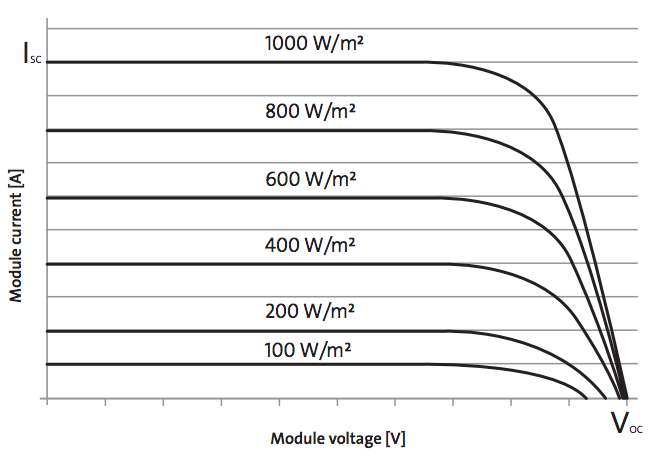 This is an example IV (current/voltage) curve out of the datasheet from my panels - it’s one I had laying around. The numbers don’t matter, because all solar panels work this way - just with different numbers on the scales.