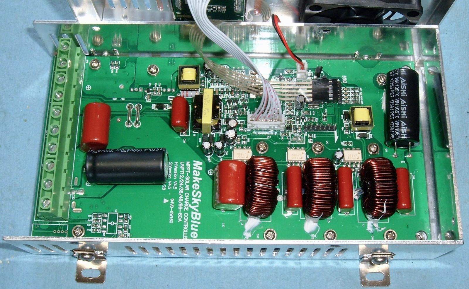 It is a tiny bit silly that the fan sucks air across the front of the circuit board when the heat generating parts are on the back and use the case as a heatsink, but in operation it seems to work just fine, and the fan isn’t running excessively (at least with my 30-35A loads), so I wouldn’t worry about it. Using the whole case as a heatsink is a really good idea, though one might want to avoid mounting it firmly against a wall. Leaving a bit of an air gap will help the unit cool.