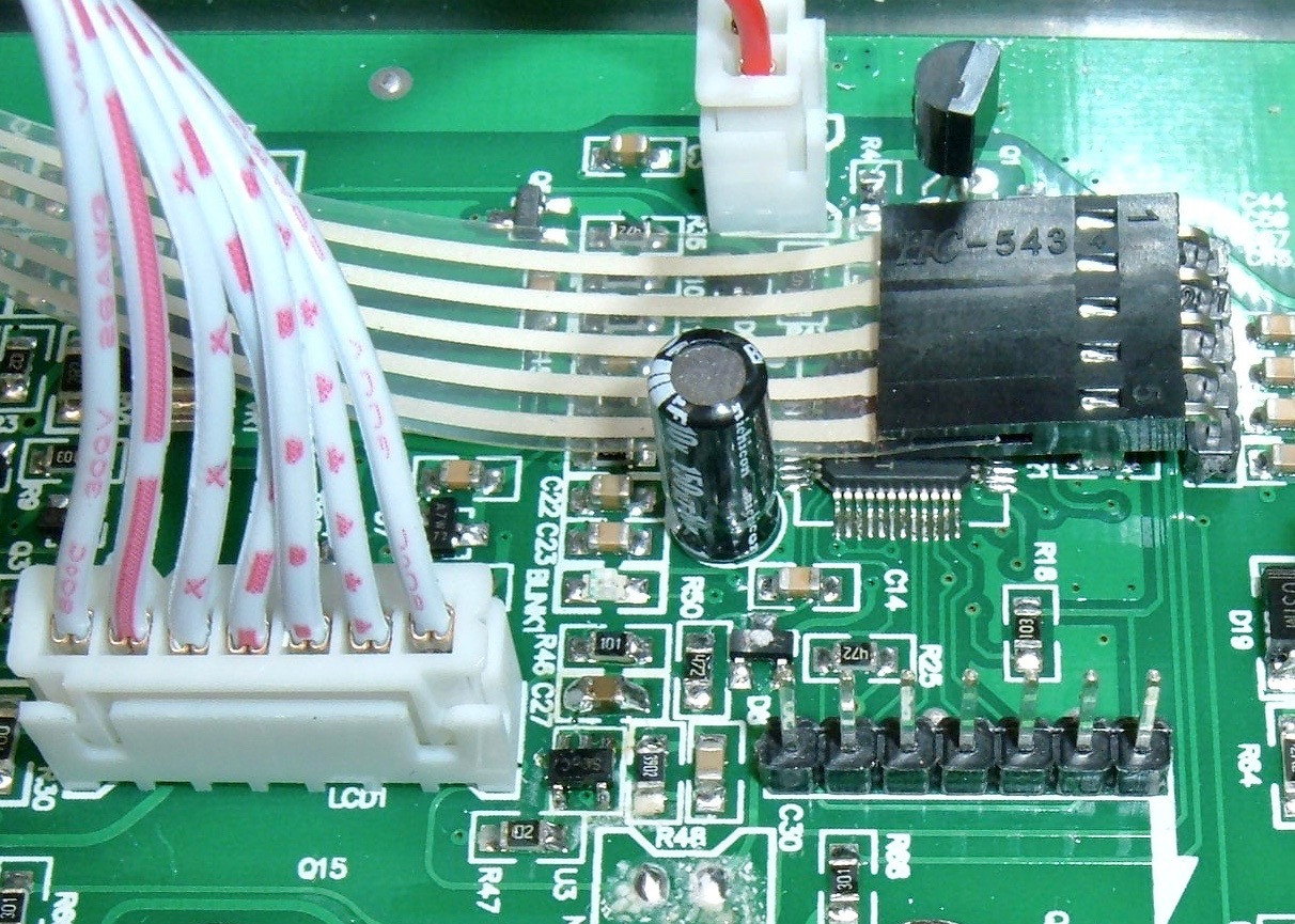 Two of the connectors are keyed so you can’t put them in backwards, but the last connector (the thin ribbon cable) isn’t. The exposed metal tabs face up or the keyboard won’t work right. But, if you look closely, there’s a seven pin connector in the lower right! Does this have anything interesting on it? Serial, perhaps? A communication interface?
