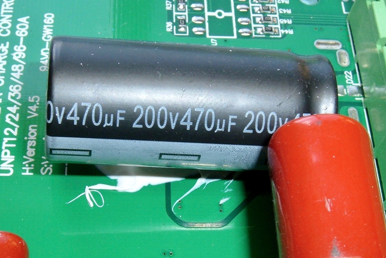 The unit is rated for a maximum PV input voltage of 190V - and here’s a 200V rated capacitor on the input side. Excellent! Assuming, of course, the capacitor is legit - but I’ll assume it is. This isn’t a dirt cheap unit that would be using fake components. It’s rare to see Chinese systems derated slightly from the absolute max they could briefly maintain, but here it is. At least some derating!