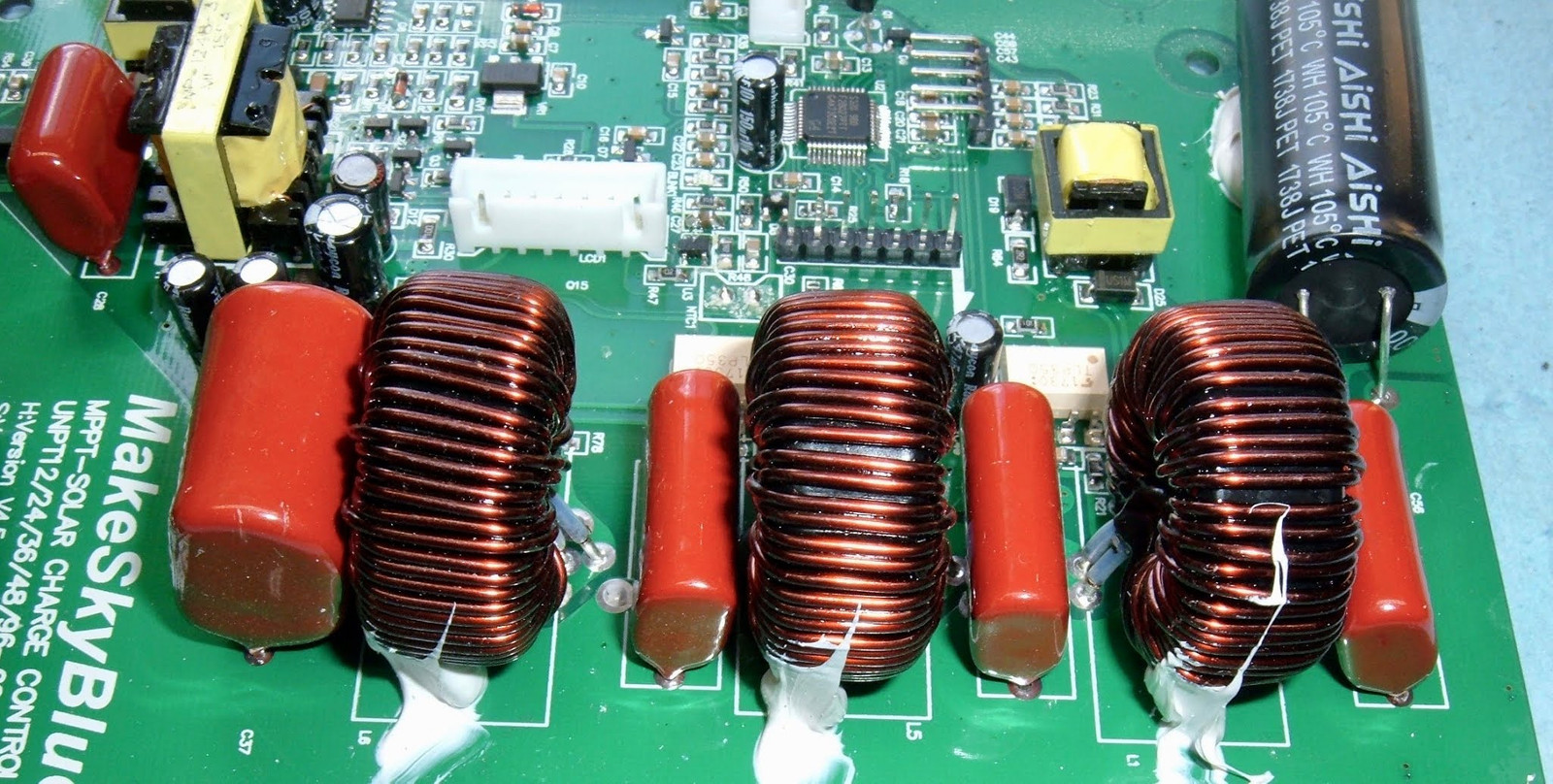 The first thing you probably notice, in the lower right corner, is a set of inductors and capacitors. This is a really, really good sign for something that claims to be a MPPT unit - and makes me believe that it actually is going to do the power conversion. A pair of electrolytic filter capacitors at either end are there to smooth the power out (they’re quite beefy units), and then there are some control electronics and a few transformers in the center, with a few connections for the controls on the lid. Nothing too exotic so far, but definitely not just a rebadged PWM unit.