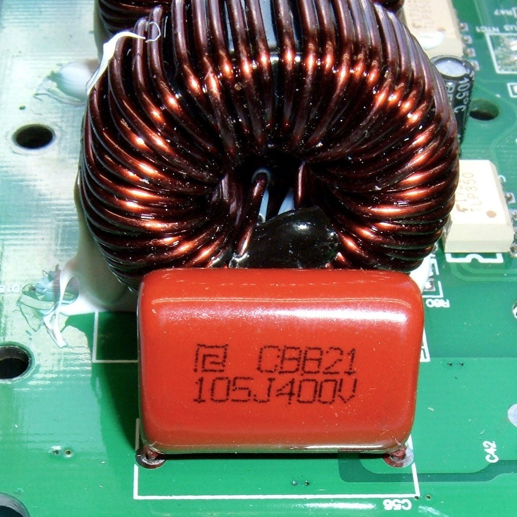Each inductor is paired with a capacitor, as should be expected for a buck converter. These are 105J400V capacitors - or 1uF, 400V polyester film capacitors. The 105 means 1uF, J means 5% tolerance, and 400V means, well, 400V. Polyester film capacitors are generally longer lived than the normal electrolytic capacitors, though a good bit larger for an equivalent capacitance. They make up for it with longer life and great ripple tolerance. Plus, they don’t dry out like electrolytic capacitors tend to do. I probably won’t have to replace these capacitors like I have with some electrolytic ones on an old mainboard.