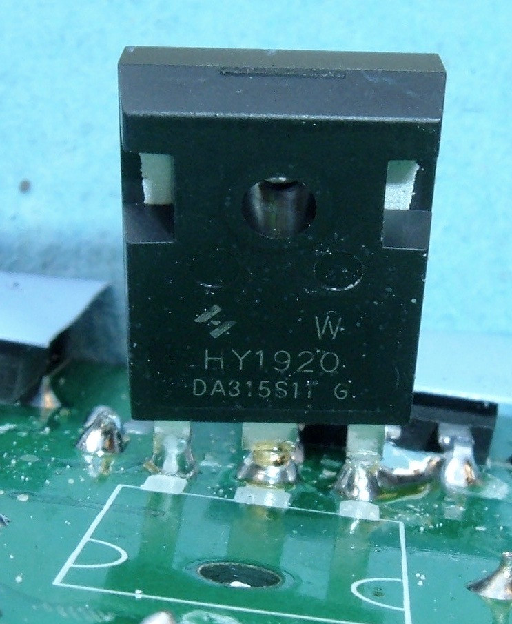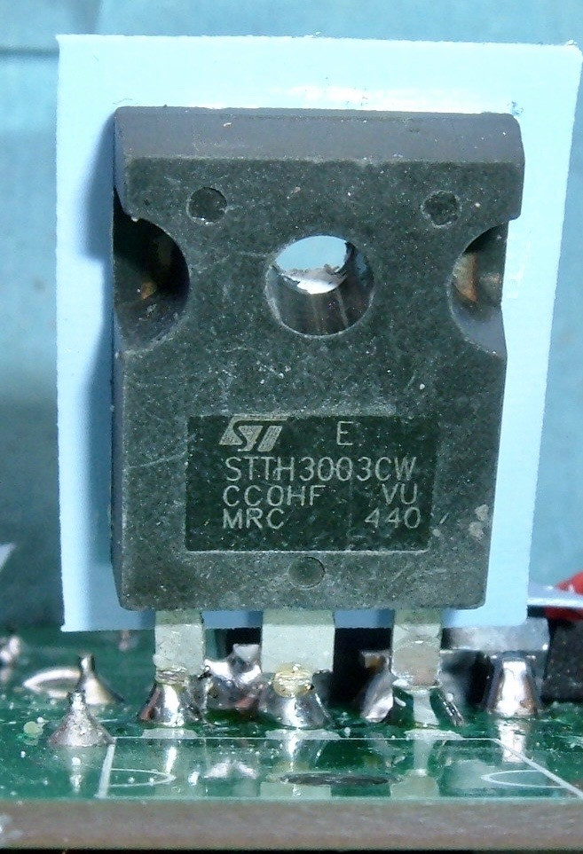 Finally, we have a STTH3003CW - a rather old secondary rectifier (diode), rated for 300V (!) and 30A (15A per leg). Again, very conservative, but given that the datasheet I found dates from 1999, I expect someone found a box of these laying around. Or, given the fact that this particular one seems to be quite beat up, got them from someone who removed them from other devices.