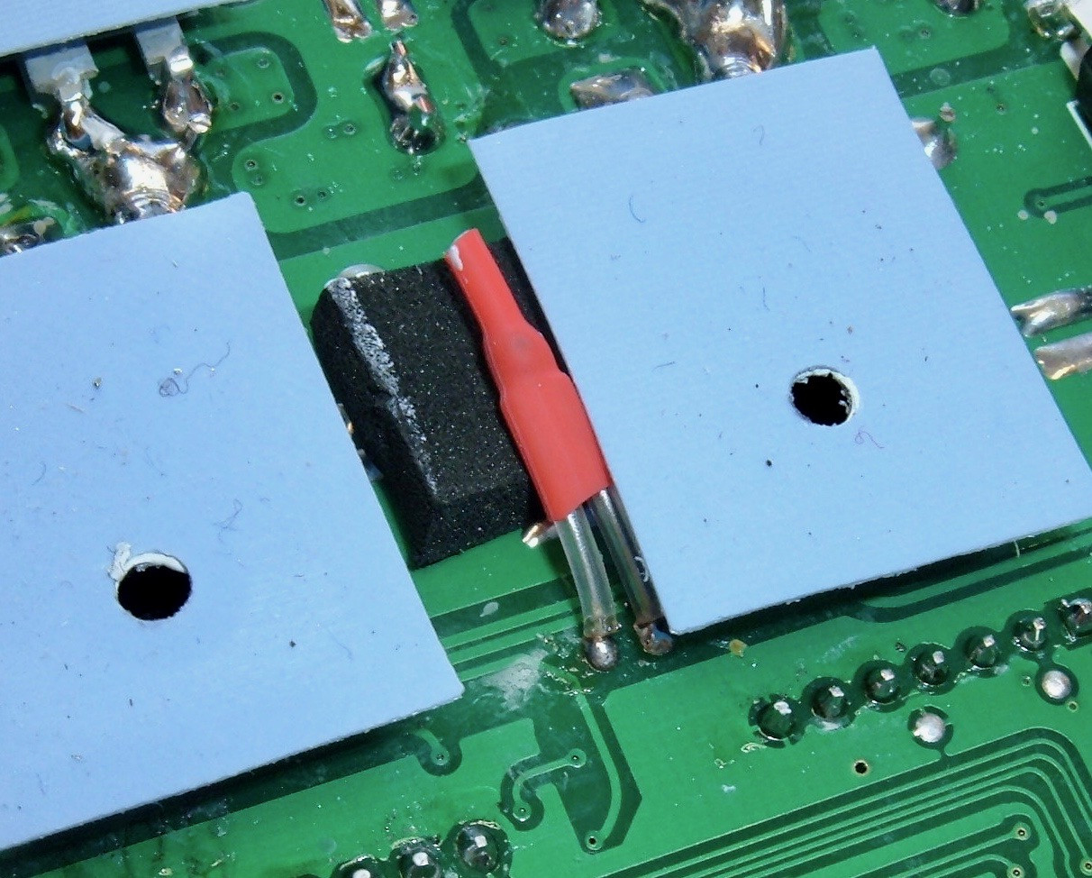 Since all the switching gear (transistors and diodes) use the back of the case as a heatsink, this is a very reasonable place to put the thermistor. Notice above that if you were to only populate one bank, this would still be in a good spot to monitor temperatures.