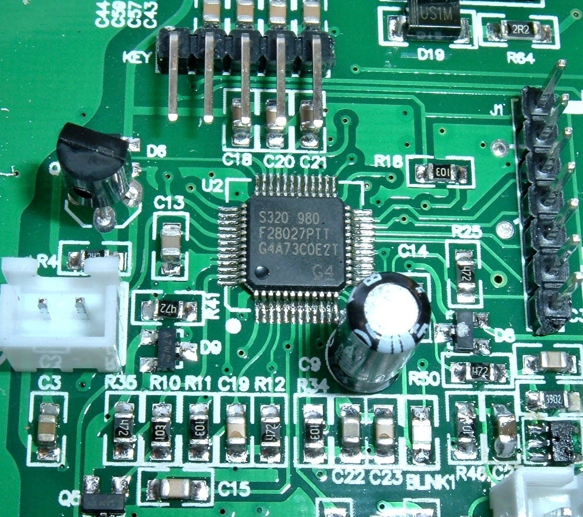 On the logic side of the unit, there’s a Texas Instruments TMS320F2802x Piccolo Microcontroller - or, at least, something that claims to be one. I haven’t found any evidence online of these being counterfeited, but that doesn’t mean much. It’s a 60MHz capable 32-bit microcontroller with some analog-digital converters (voltmeters) and some high resolution, high frequency PWM (pulse width modulated) outputs that are perfect for driving things like buck converters. It’s always interesting to see what chip is used to control various devices, but this chip looks very well suited to being the brains of a MPPT unit like this.