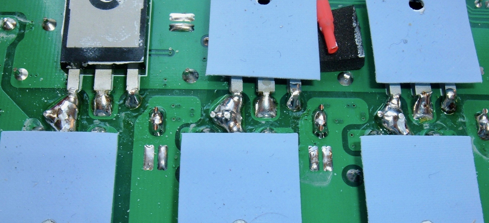 Flipping the board over, there are some current traces and a bunch of semiconductors. If you’re playing along at home, the top side has the inductors and capacitors, which means the bottom side must have the switching transistors and diodes. Presumably, three pairs! And I see six large ICs opposite the inductors! The pads on the bottom of the semiconductors are insulators that keep the (electrically active) metal back from grounding out on the case - I removed one of them to show off the metal back (and some of the others stuck to the case anyway).