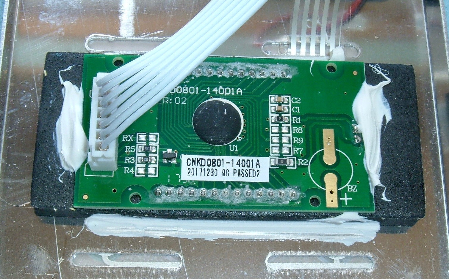 Finally, on the back, there’s a little thermistor. This is a standard device for determining temperature, and just about every bit of electronics has one. The red piece of heat shrink over it helps prevent it from grounding out against the case over time, and the black chunk of foam presses it against the case back.