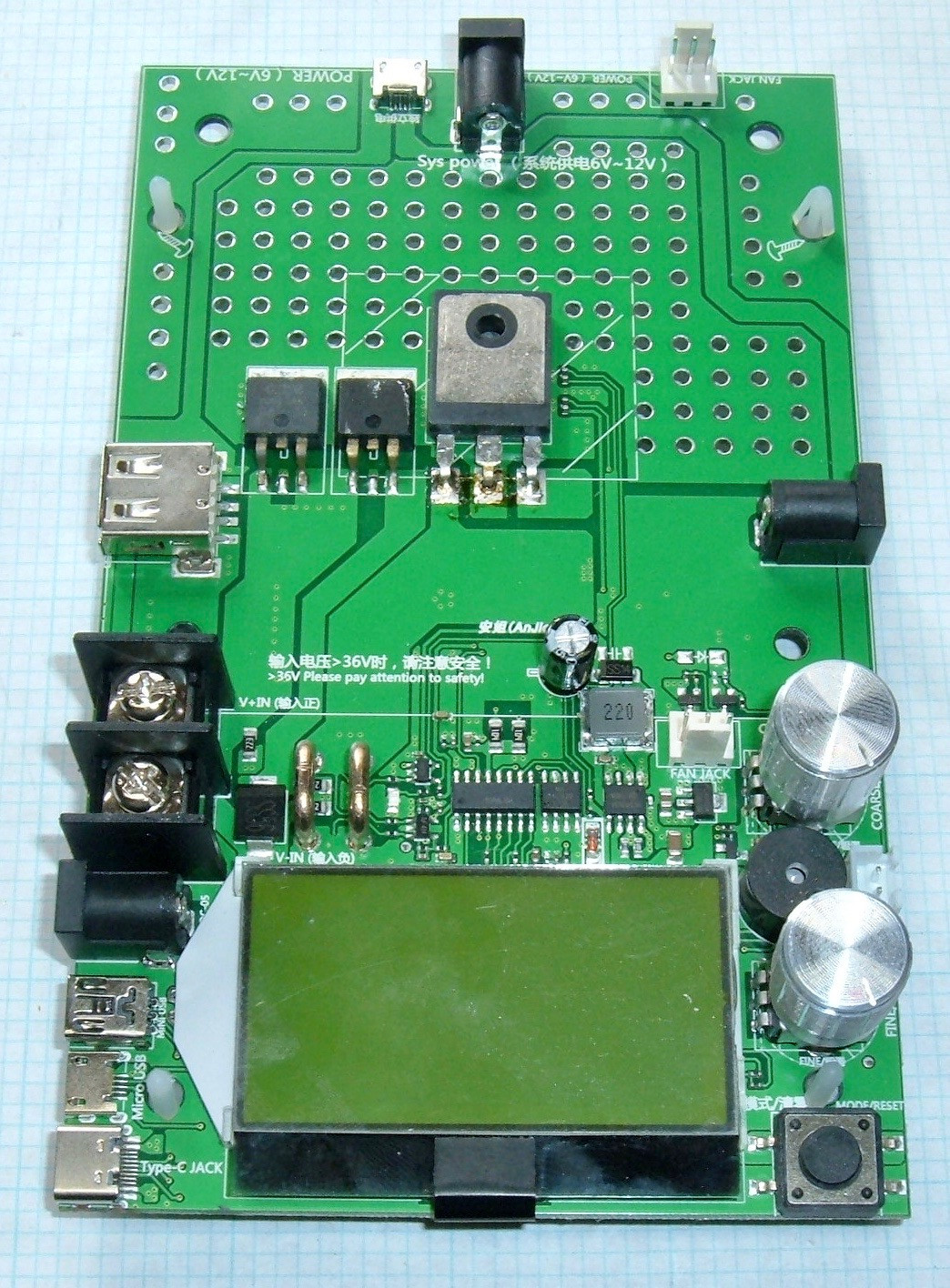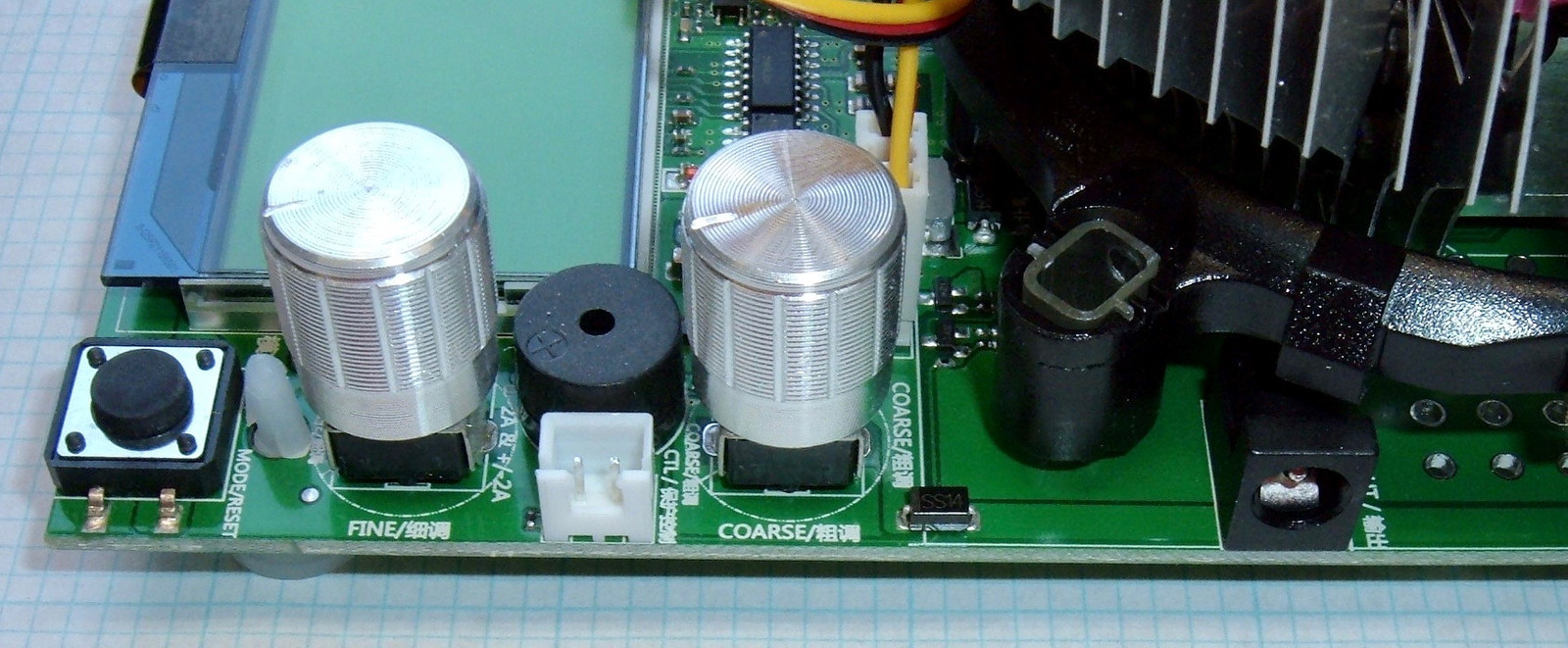 Flipping the board around, we’ve got the controls and output side. There’s a button in the lower left here that handles (via arcane button presses) the control of the digital side. The “fine” and “coarse” knobs control the current through the system, there’s a little beeper, a two pin jack whose function I have not discerned (I’d expect it’s current control via analog voltages, but am truly tired of replacing MOSFETs), and, interestingly, an output barrel plug (on the right). This is live to the input, and seems useful for chaining devices together if you want more power capacity. Unfortunately, this sort of barrel plug isn’t good for more than a few amps (reliably), so I’m not sure what actual benefit you’d get from chaining devices. A pair of screw terminals would be radically more useful as an output.