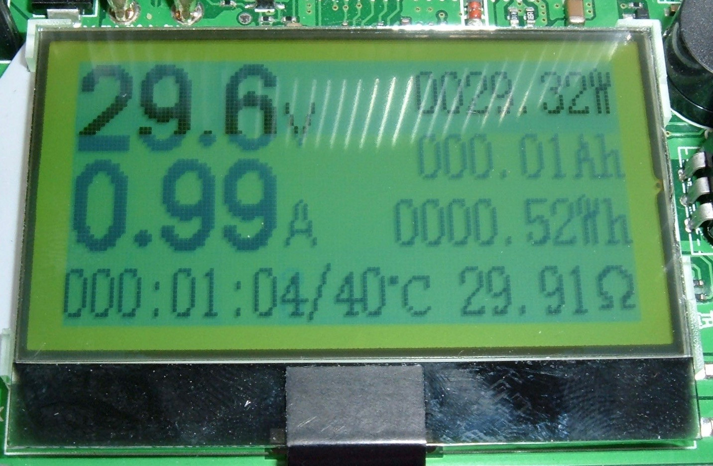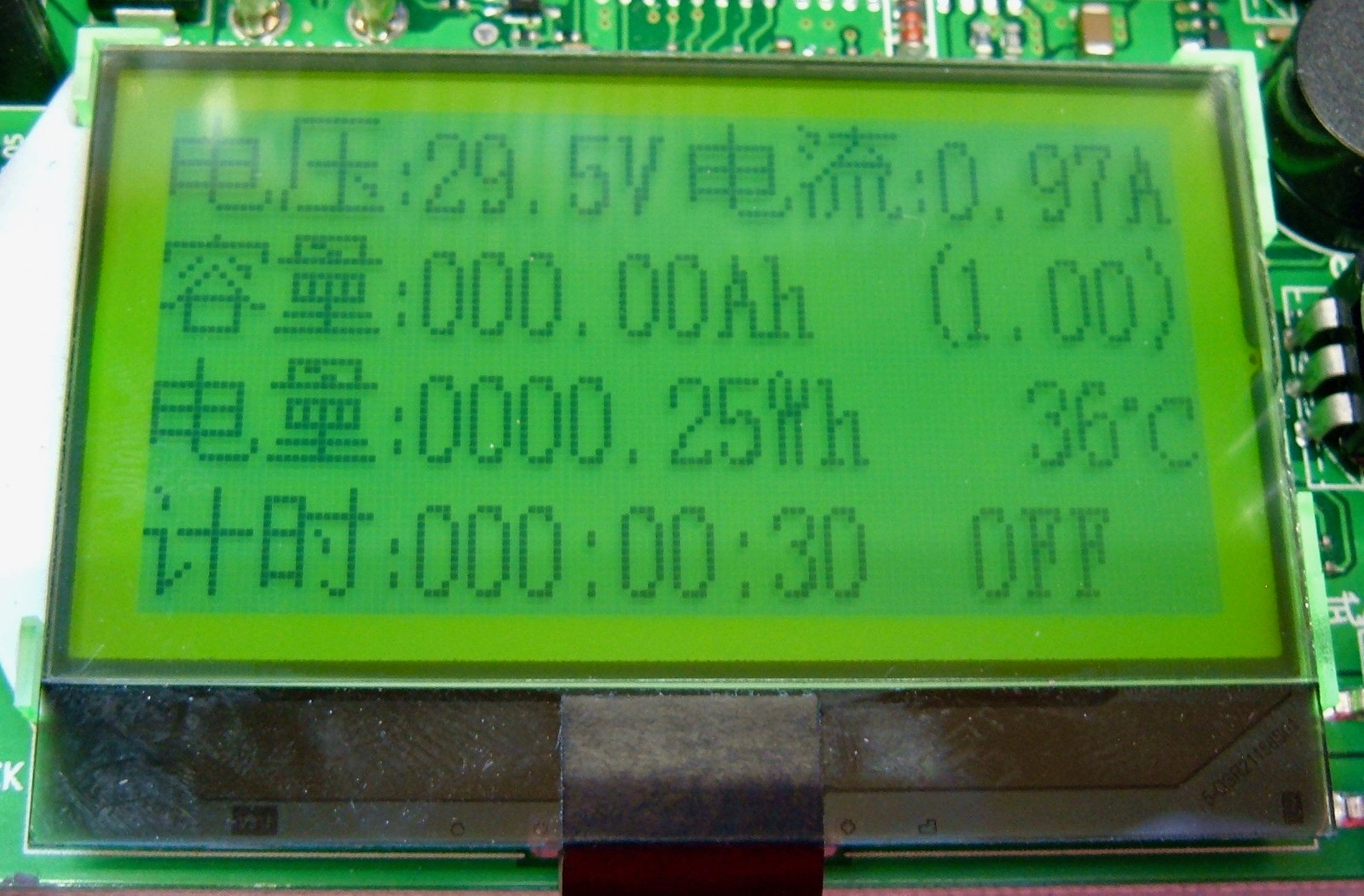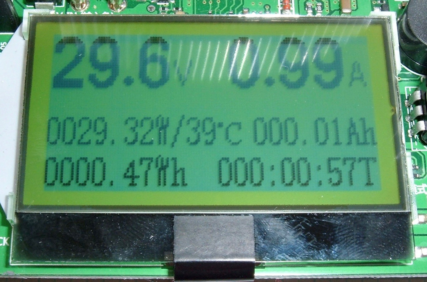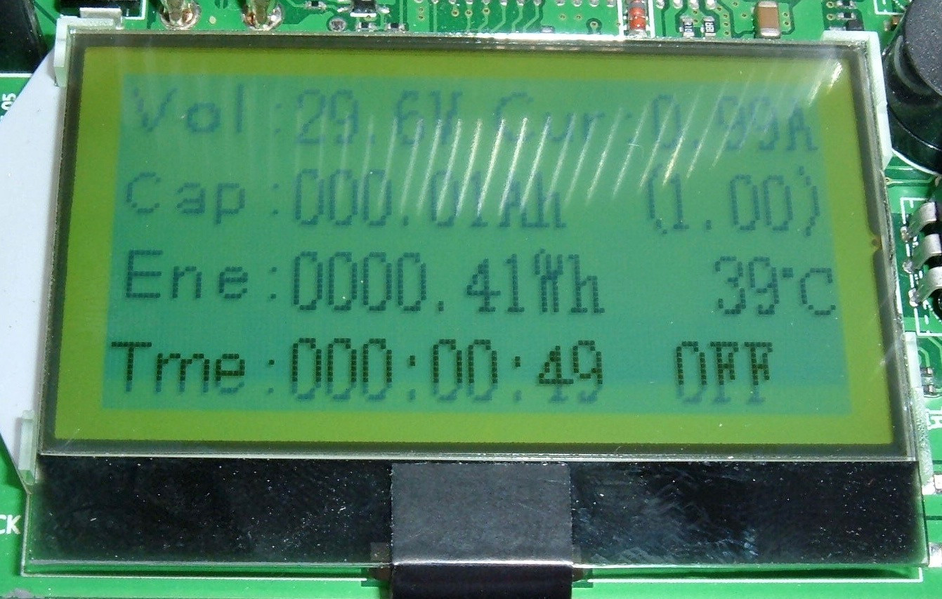 Cycle forward, you get the same display, but with English labels. Stuff is pretty obvious based on the units - the top entry is the current voltage, capacity is in amp-hours, energy is in watt-hours, time is the thing that counts up, current amperage is in the top right, I have no idea what the (1.00) field is for, and the unit temperature is in degrees Celsius.