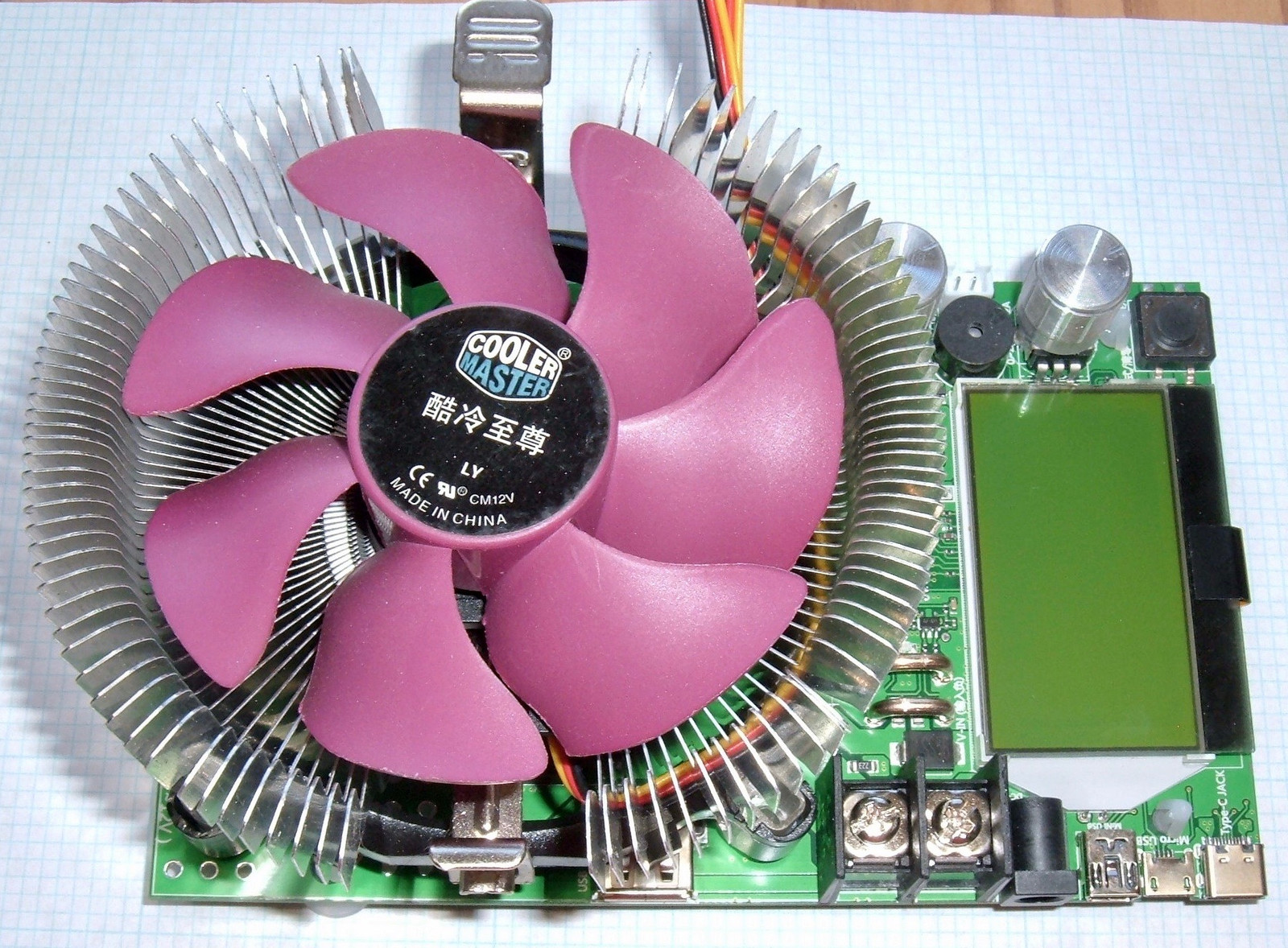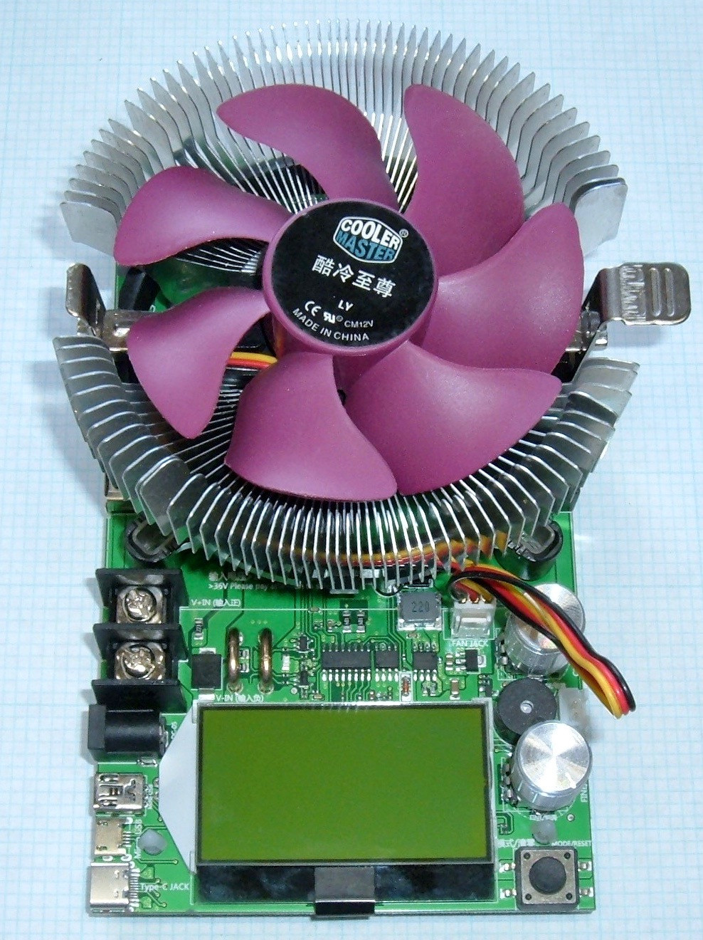 Following up my previous review of some 150W load banks, I’ve got another load bank on my bench for analysis. This one is alternately sold as a 150W discharge tester, a 185W discharge tester, and probably other stuff I haven’t found. It has a purple fan, a high resolution LCD, and two knobs on the right, plus a boatload of USB ports for input.