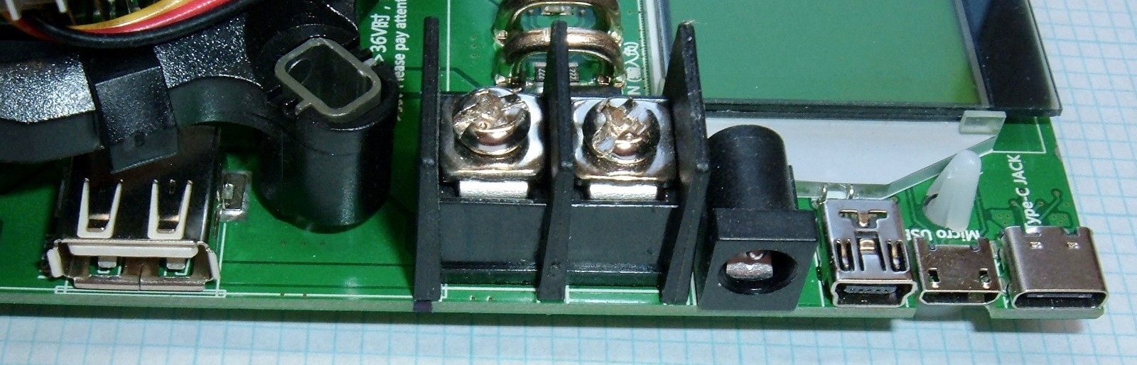 On paper, this is a pretty exciting little unit. It’s rated for 200V, 20A, 150W (or more, depending on who is advertising it), and it comes with a wide variety of input connections. From left to right, you’ve got a USB A connector, a pair of solid screw terminals, a barrel plug, a mini USB connector, a micro USB connector, and a USB-C connector. I don’t think the USB-C connector does power delivery negotiation for higher voltages (at least, I see no evidence of this, and don’t care to blow up a USB charger to find out).